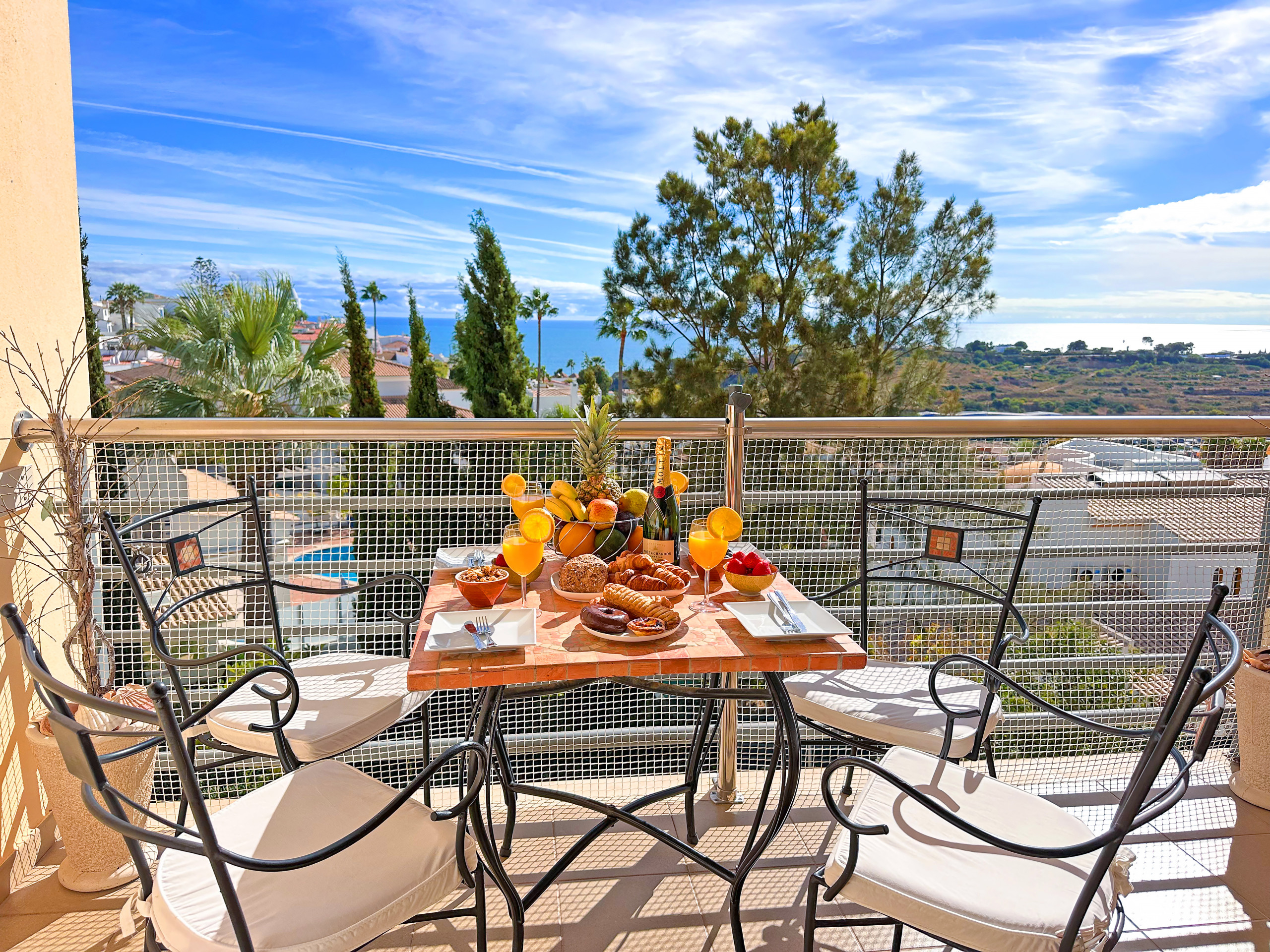 • Ein entzückender Balkon außerhalb des Wohnzimmers, der atemberaubende Ausblicke auf den Garten, den Pool und spektakuläre Sonnenuntergänge bietet