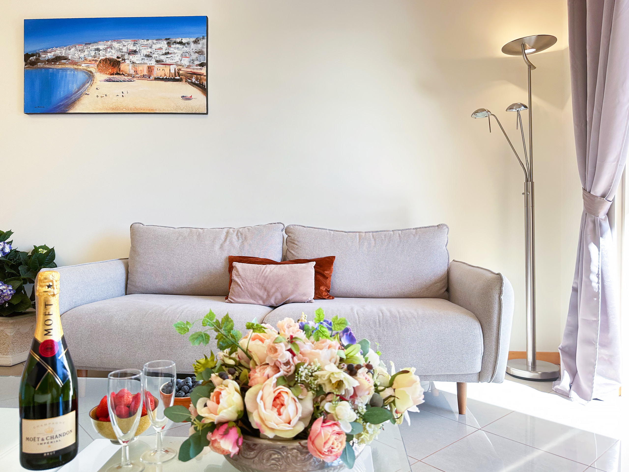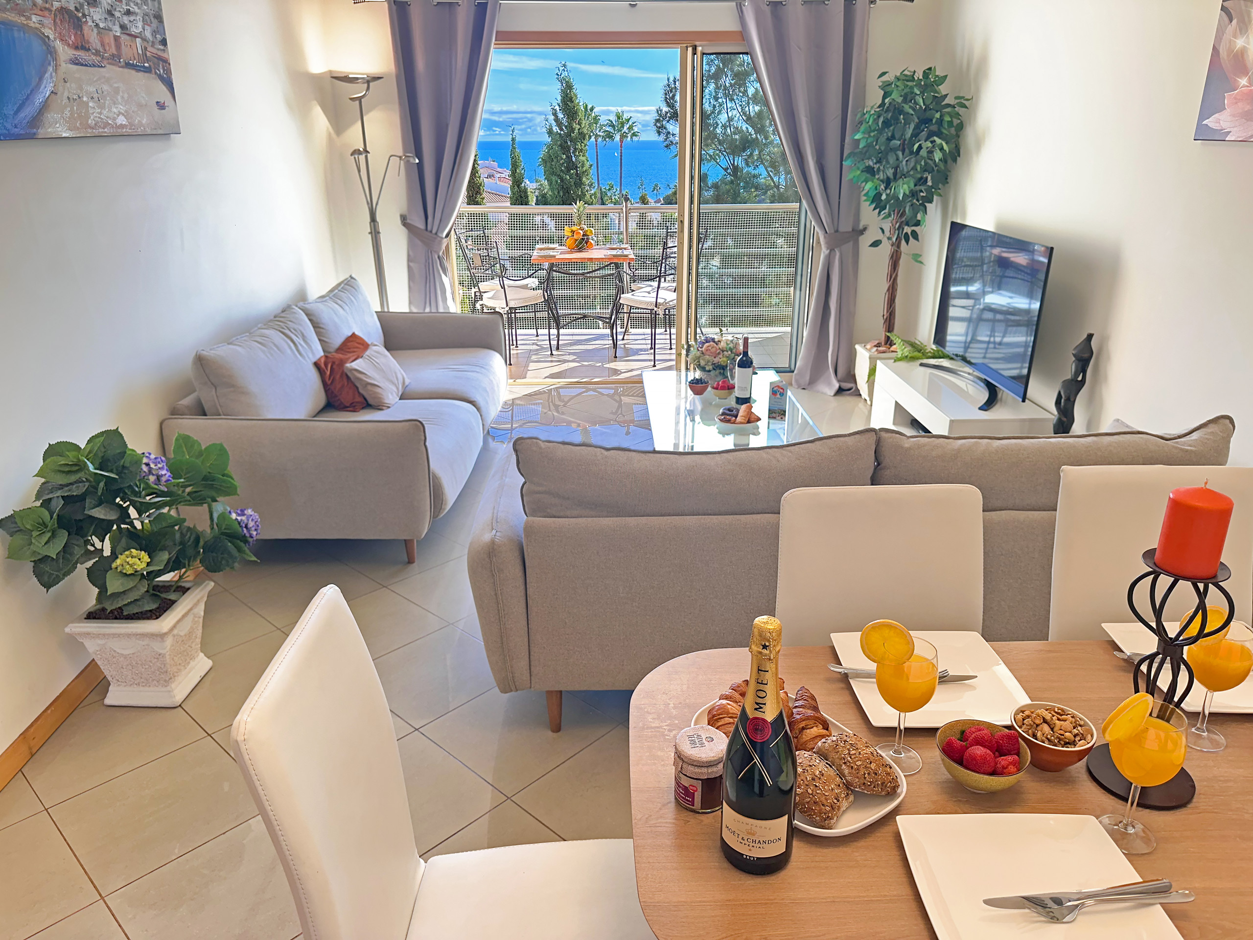 Vom liebevoll eingerichteten Wohnzimmer aus haben Sie einen atemberaubenden Blick über das wunderschöne Meer und die moderne Marina.