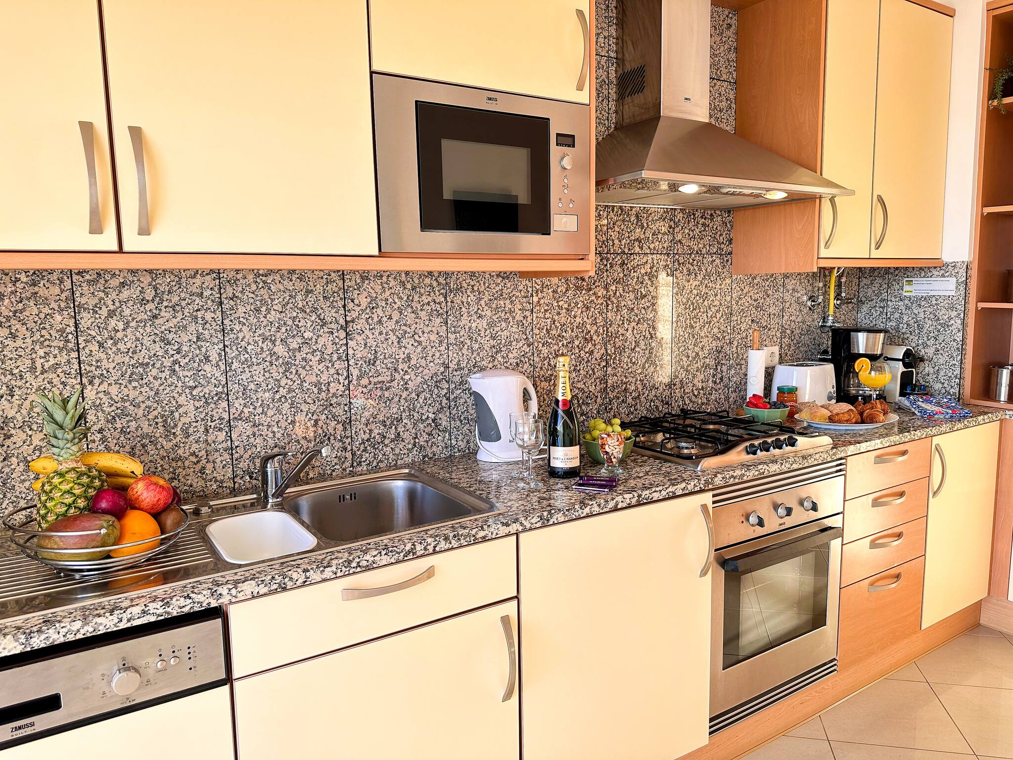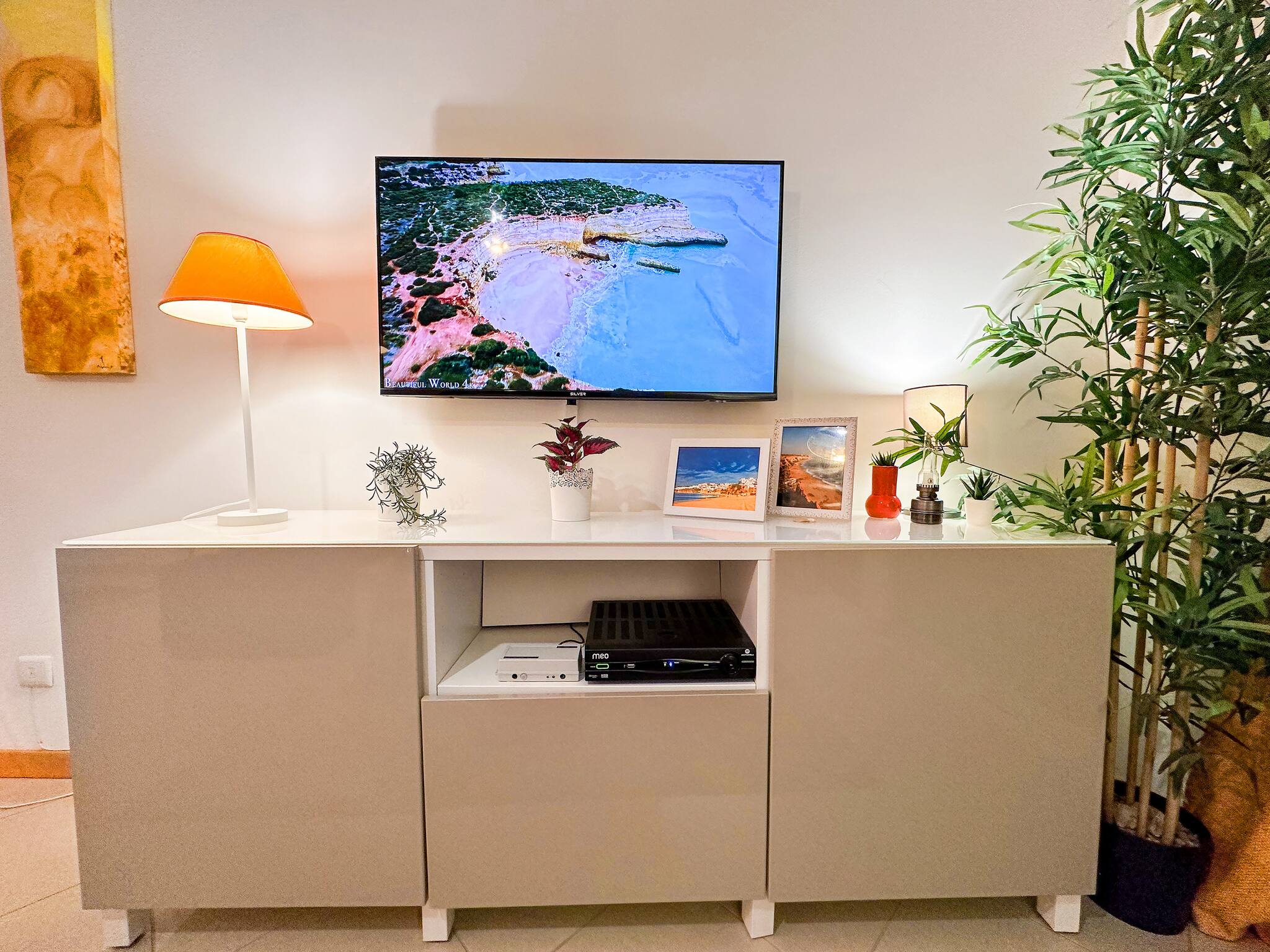 El apartamento está completamente climatizado y exquisitamente equipado con un dormitorio, incluyendo una cama de matrimonio. El salón es espacioso y tiene instalaciones de comedor, así como un sofá cómodo para relajarse y/o usar como una cama adicional extensible. Tiene internet de fibra óptica de alta velocidad, para que pueda transmitir su película favorita de Netflix en un excelente smart TV de 50 pulgadas.
