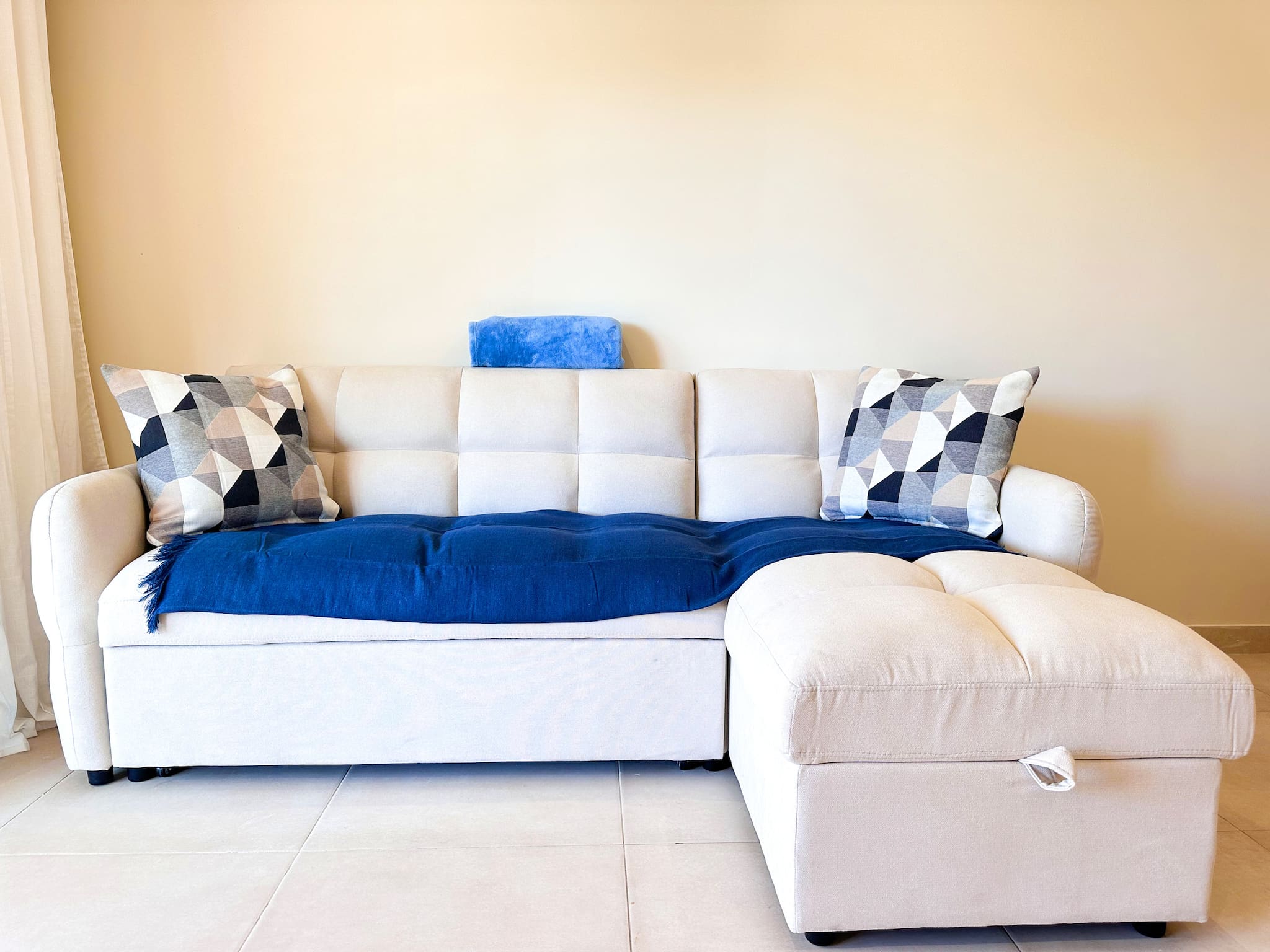 - La espaciosa sala de estar incluye un televisor, una mesa de comedor para seis personas y un sofá, con espacio para alojar a 1 huésped adicional utilizando una cama plegable.
