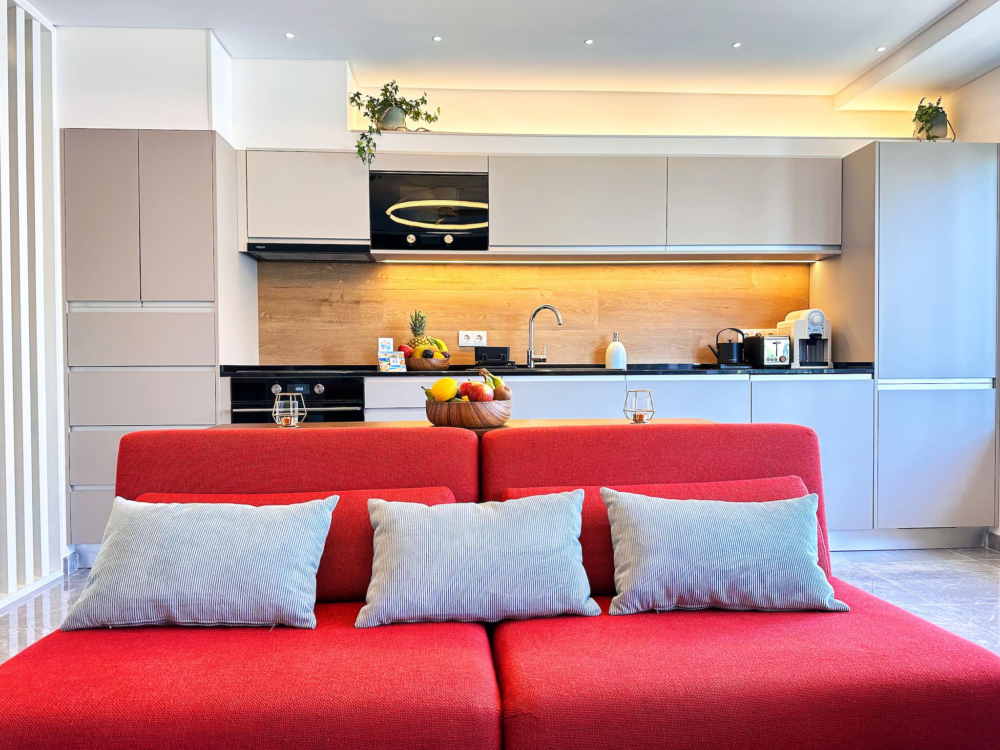 La cocina independiente, de inducción, está equipada con nevera, microondas, horno, congelador, lavavajillas, vajilla/cubertería, utensilios/cocina, cafetera, tostadora, hervidor de agua, exprimidor y fogones.