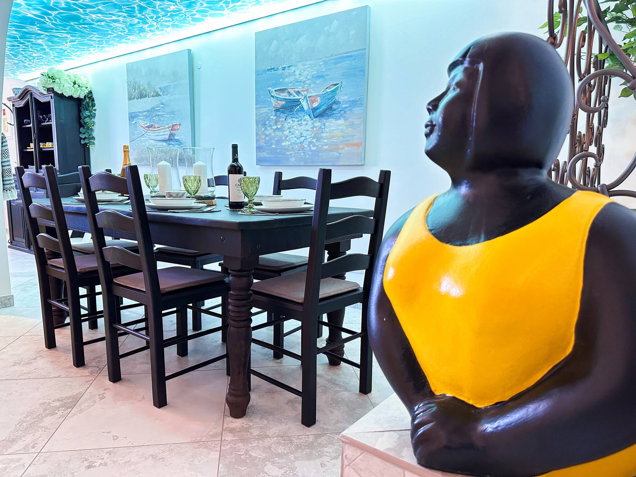 En la sala de estar, una mesa de bar junto a la ventana te invita a sentarte y soñar despierto mientras contemplas la playa y