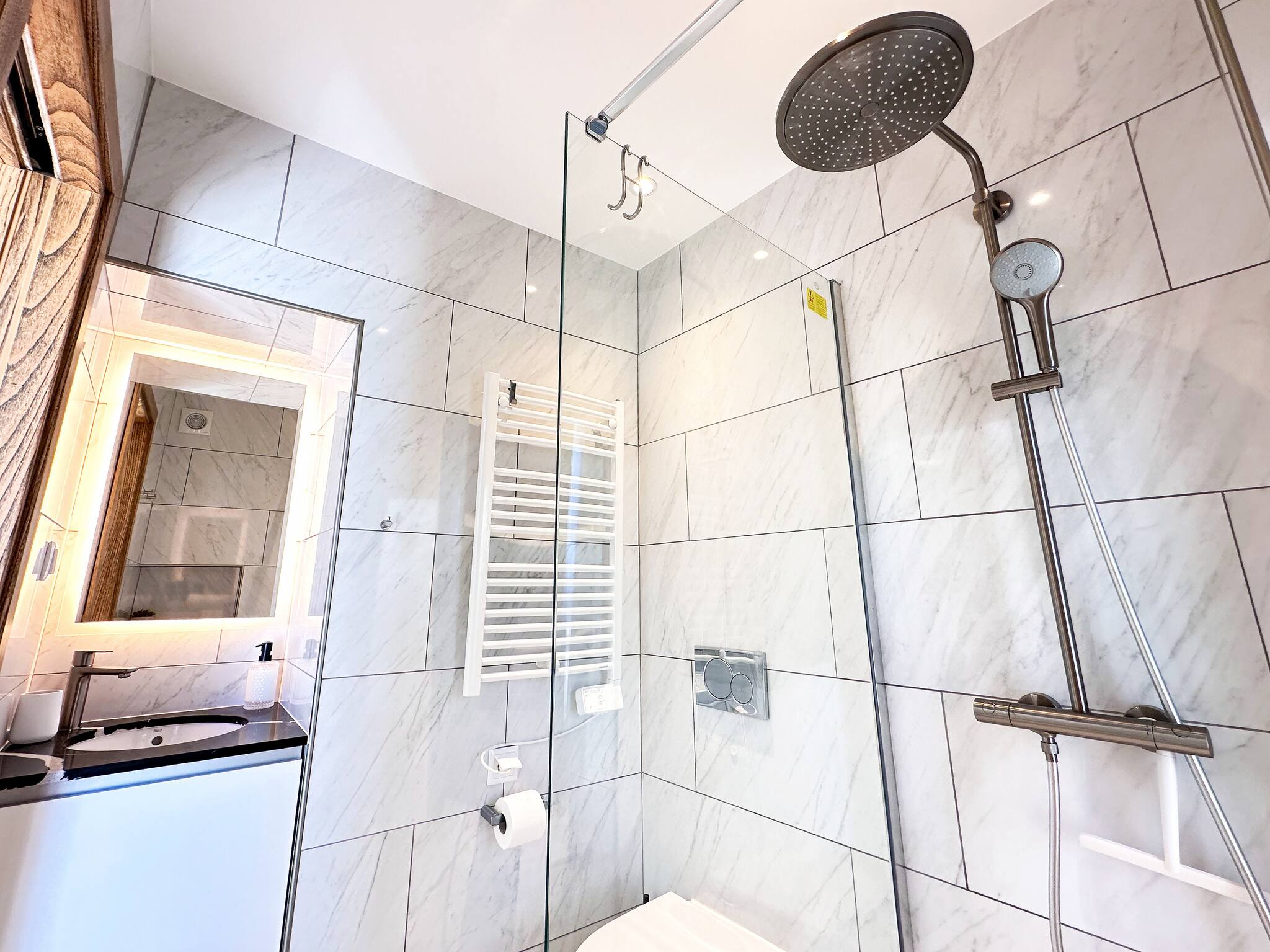 Dando servicio a ambos dormitorios hay un baño compacto pero completo con ducha. El baño tiene un hermoso portillo original