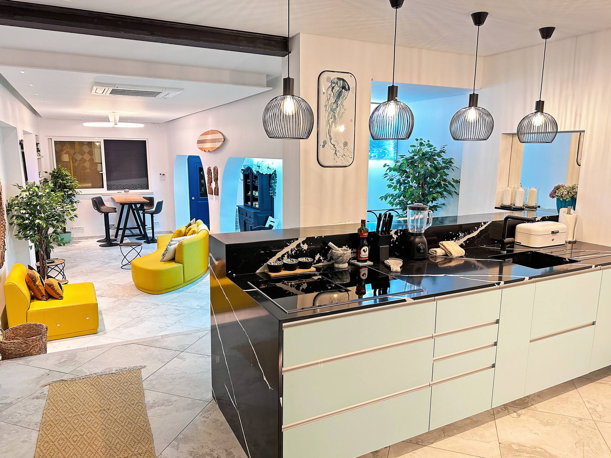 La distribución de planta abierta garantiza que cocinar sea un evento social, con una vista perfecta del océano a través de la ventana de la sala de estar, lo que hace que el tiempo pasado en la cocina sea delicioso.