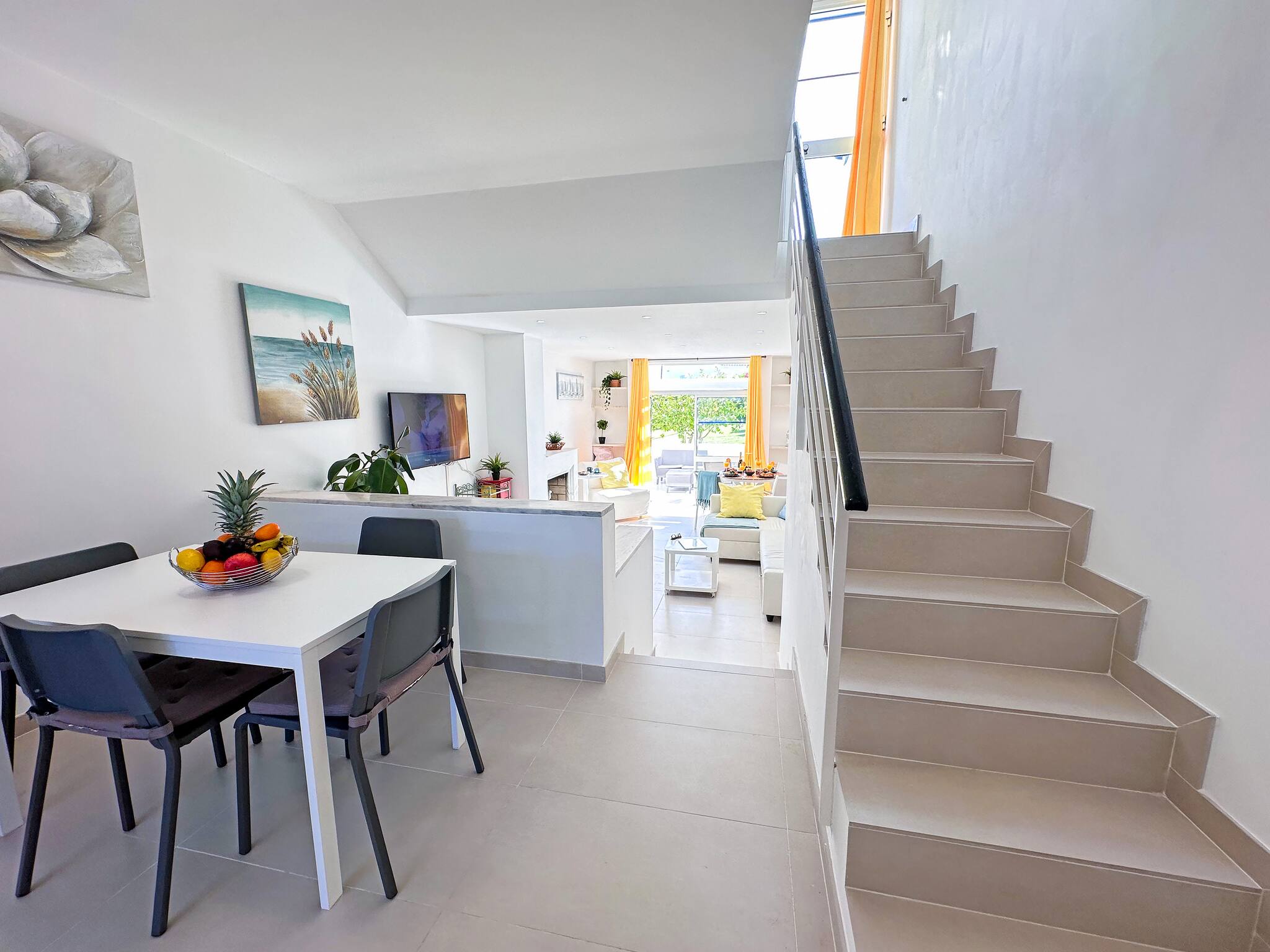 La entrada privada de la casa en la planta baja conduce al amplio espacio diáfano de salón, comedor y cocina totalmente equipada. La gran zona de estar incluye un televisor, un sofá y puertas de patio que dan acceso a la terraza con una zona de asientos.