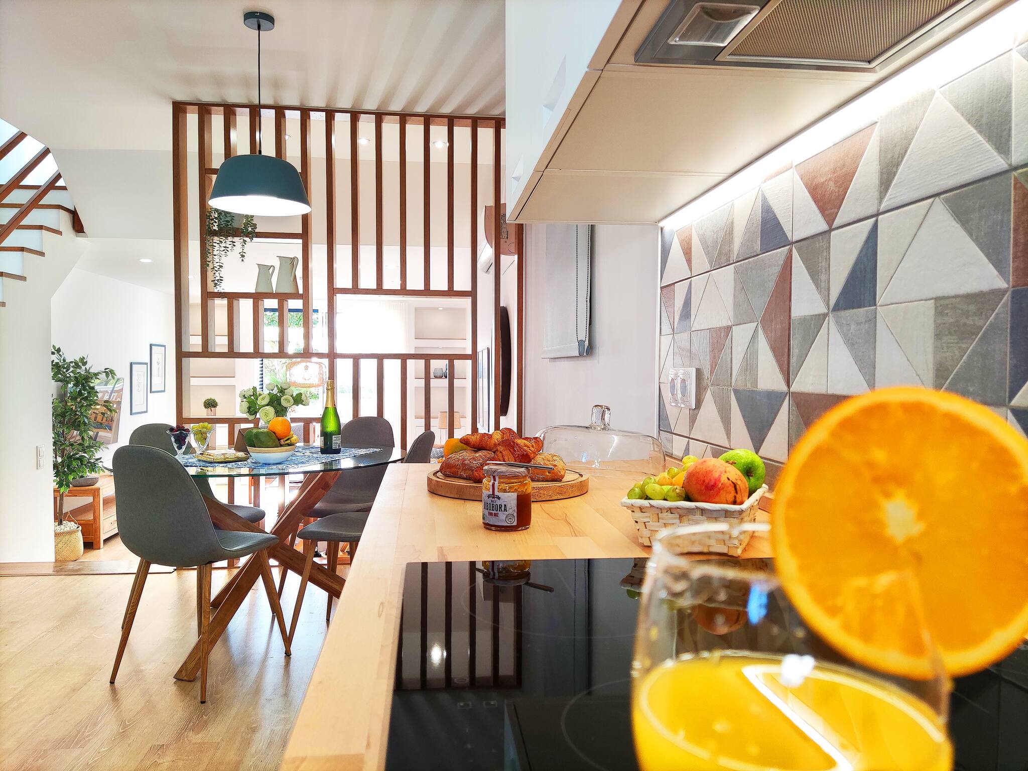 Le rez-de-chaussée présente un espace de vie ouvert spacieux comprenant un salon, une salle à manger et une cuisine entièrement équipée qui donne sur une terrasse avec un espace de repas extérieur supplémentaire, conçu pour le confort et la détente quotidiens dans un cadre de haute qualité. L'espace de vie comprend un téléviseur intelligent de 65 pouces et une barre de son pour le divertissement, et la cuisine inclut un lave-vaisselle intégré, un lave-linge et une machine à café automatique avec broyeur.