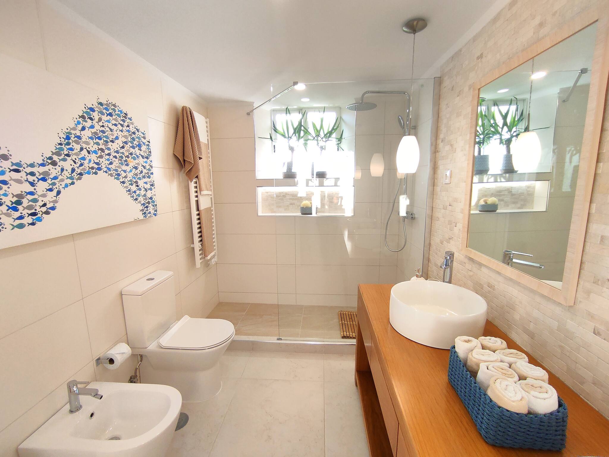La salle de bain est spacieuse et équipée d'une douche de bien-être et d'un bidet. La cuisine est parfaitement équipée de tout ce dont vous avez besoin pour préparer vos repas, collations ou cocktails inspirés de la mer, y compris une machine Nespresso. Le balcon dispose d'une table de bar pour que vous puissiez manger ou boire tout en observant les piétons passer en dessous ou simplement vous détendre sur l'un des transats et regarder l'océan en souhaitant que ce rêve ne se termine pas :-)