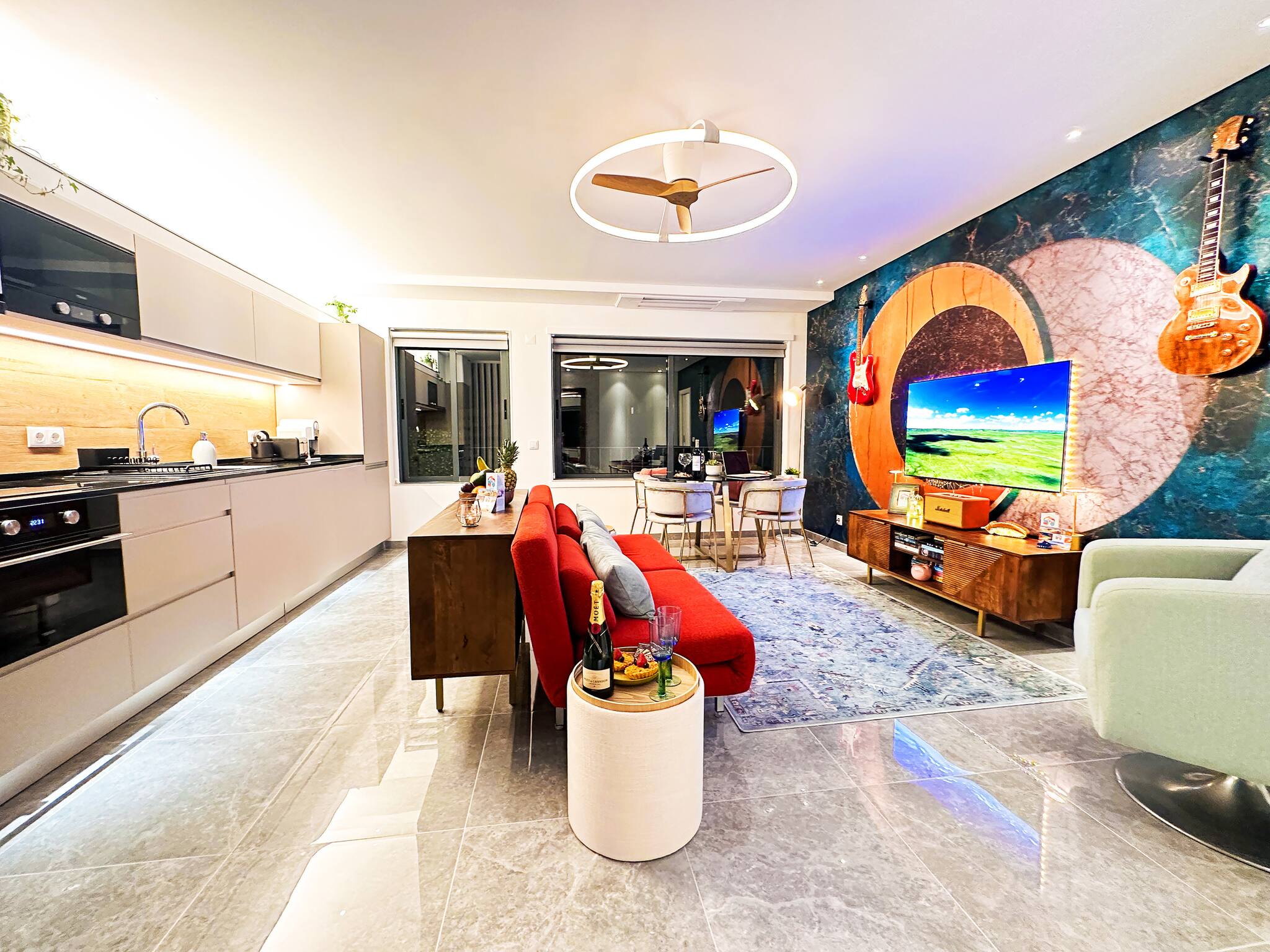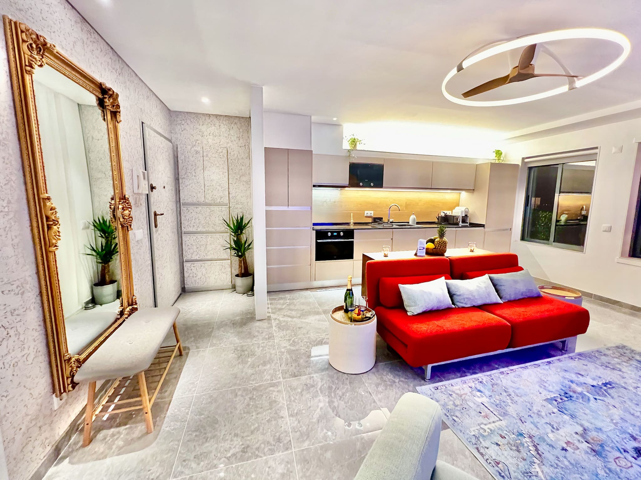 La cuisine indépendante, à induction, est équipée avec réfrigérateur, micro-ondes, four, congélateur, lave-vaisselle, vaisselle/couverts, ustensiles/cuisine, cafetière, grille pain, bouilloire, presse-agrumes et cuisinière.