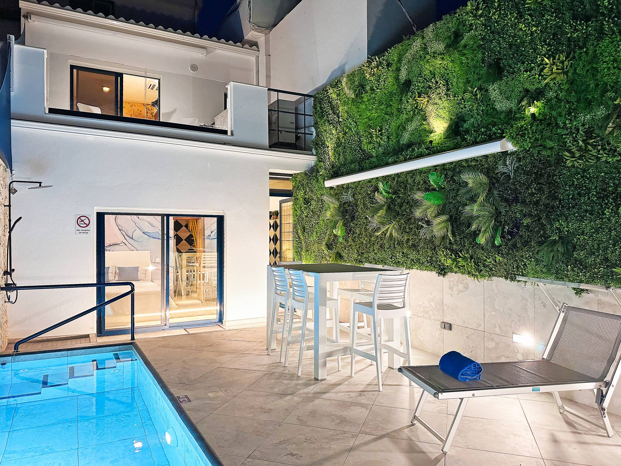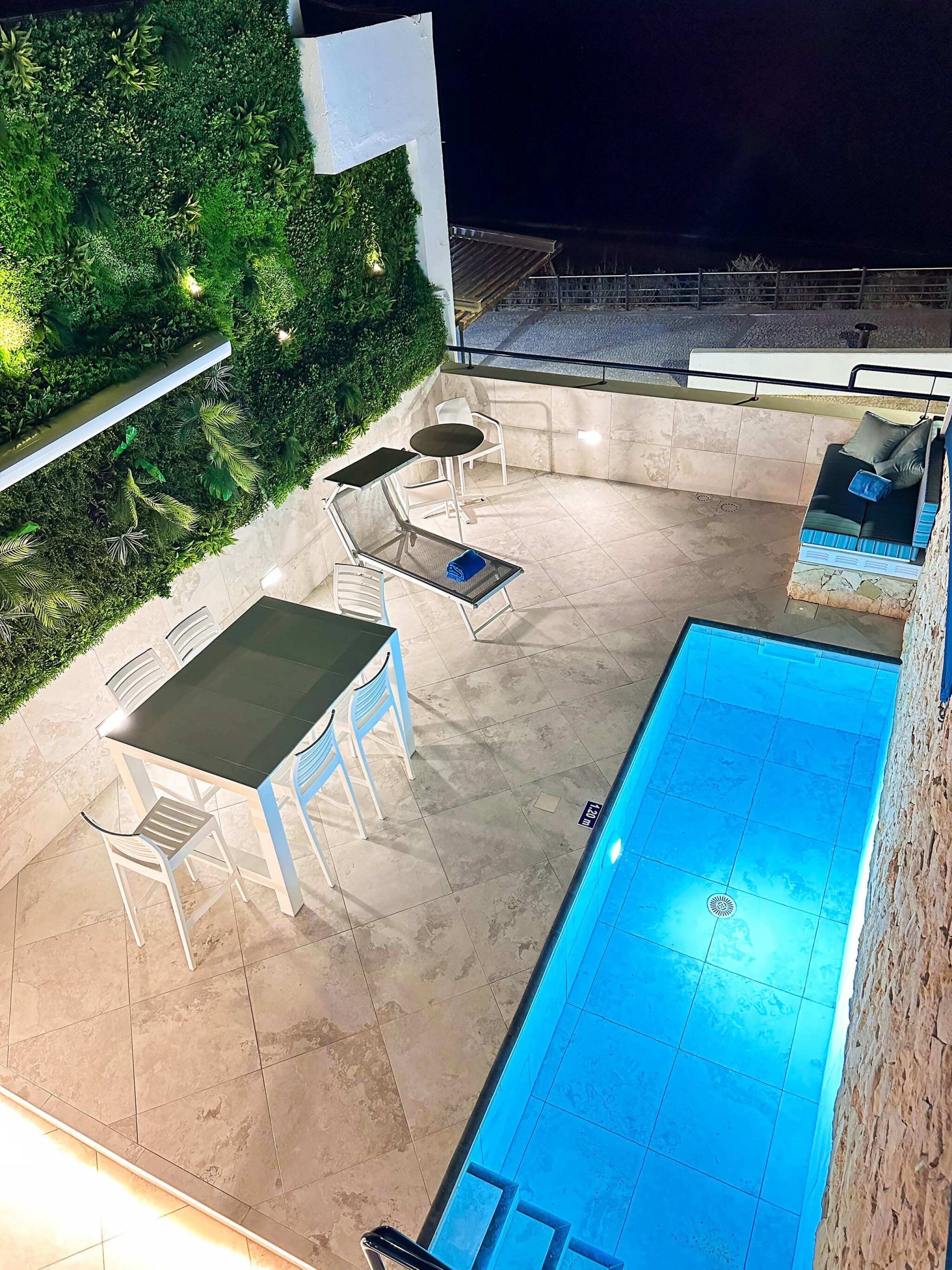 d'un jardin vertical de 8 mètres de haut de l'autre. Une piscine moderne et une douche extérieure (avec eau chaude) offrent tout