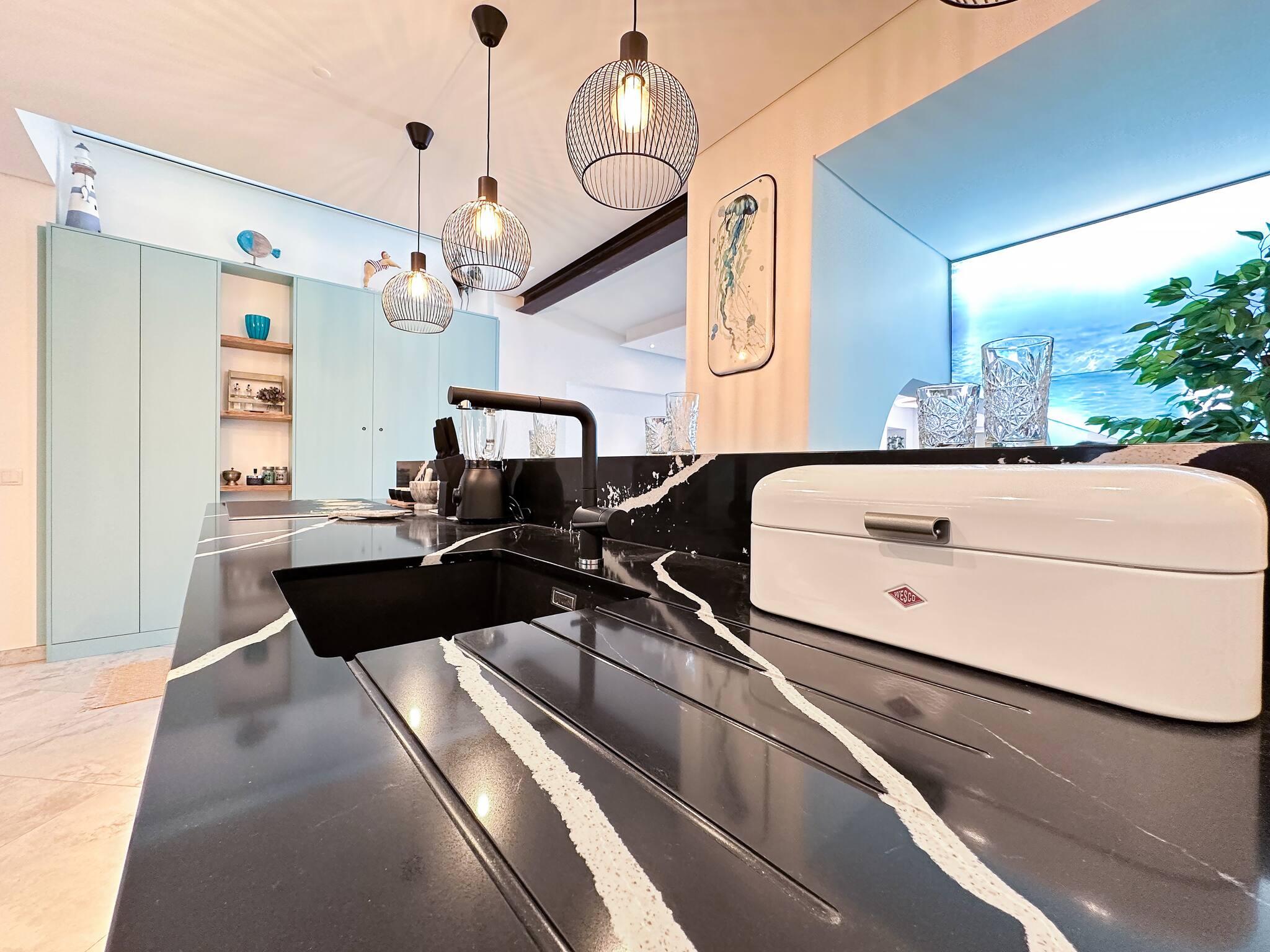 La disposition en plan ouvert garantit que la cuisine est un événement social, avec une vue sans couture sur l'océan à