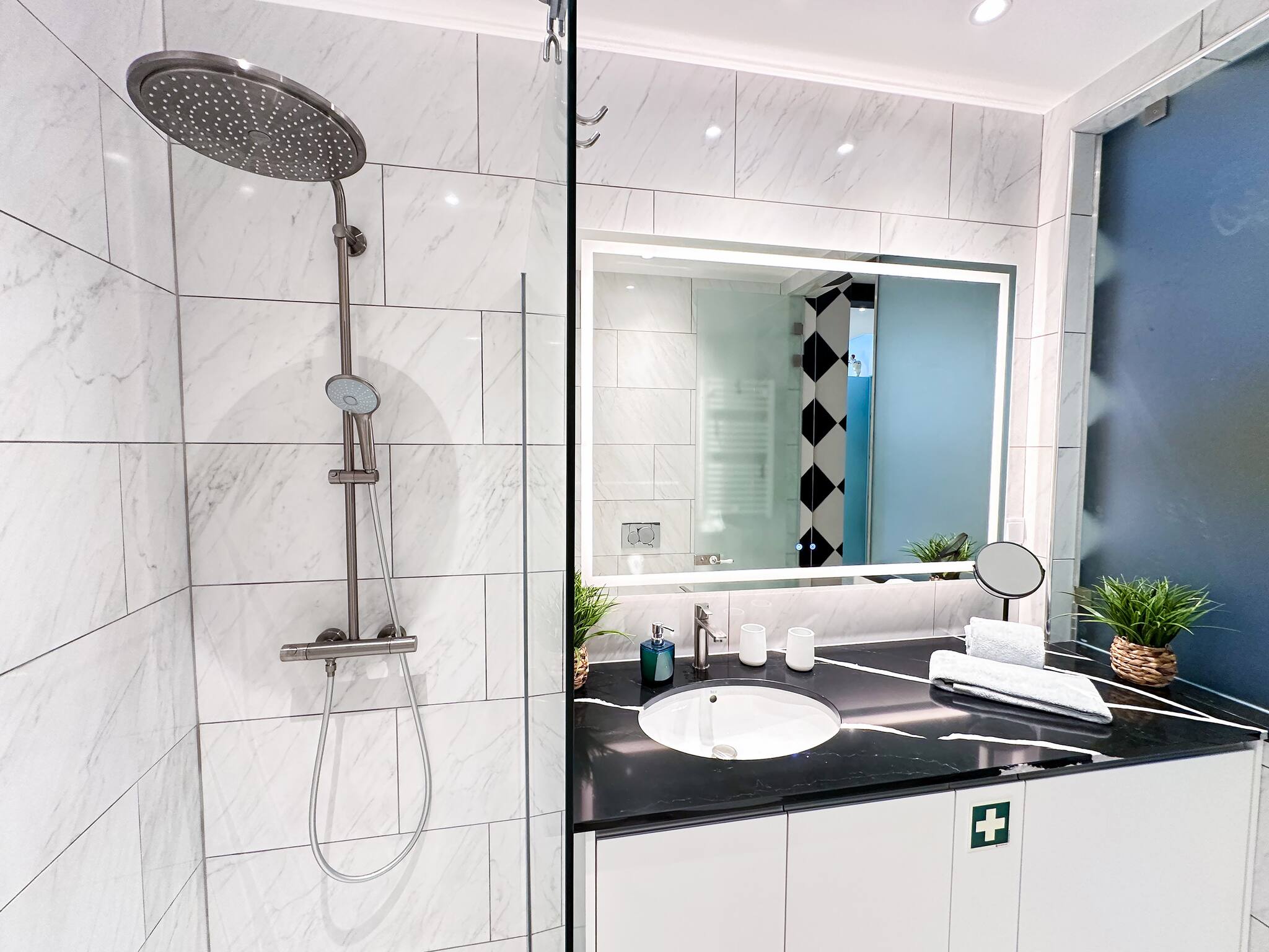 Desservant les deux chambres, une salle de bain compacte mais complète avec douche. La salle de bain possède un beau hublot original