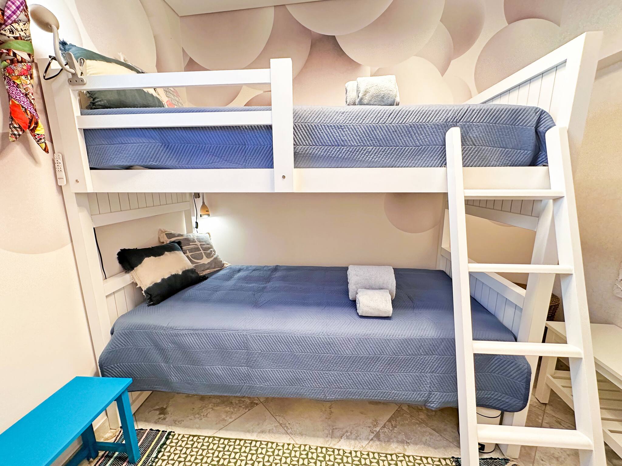 Au 1er étage se trouve une chambre décorée de manière unique avec un lit superposé pleine grandeur charmant (2x lits de 90x200).