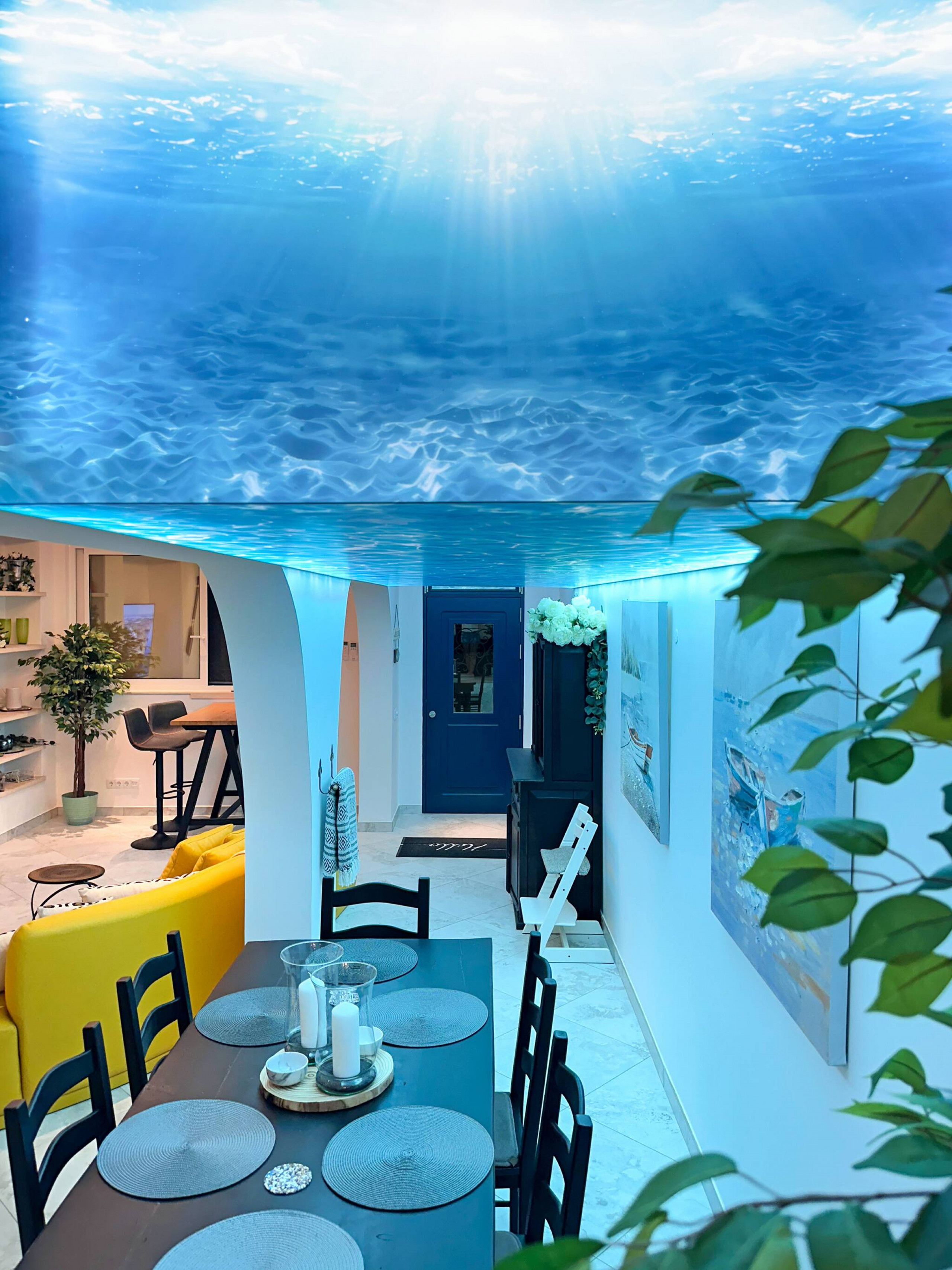 d'une image sous-marine éclairée s'étendant sur le plafond. Les arches latérales mènent naturellement à un salon