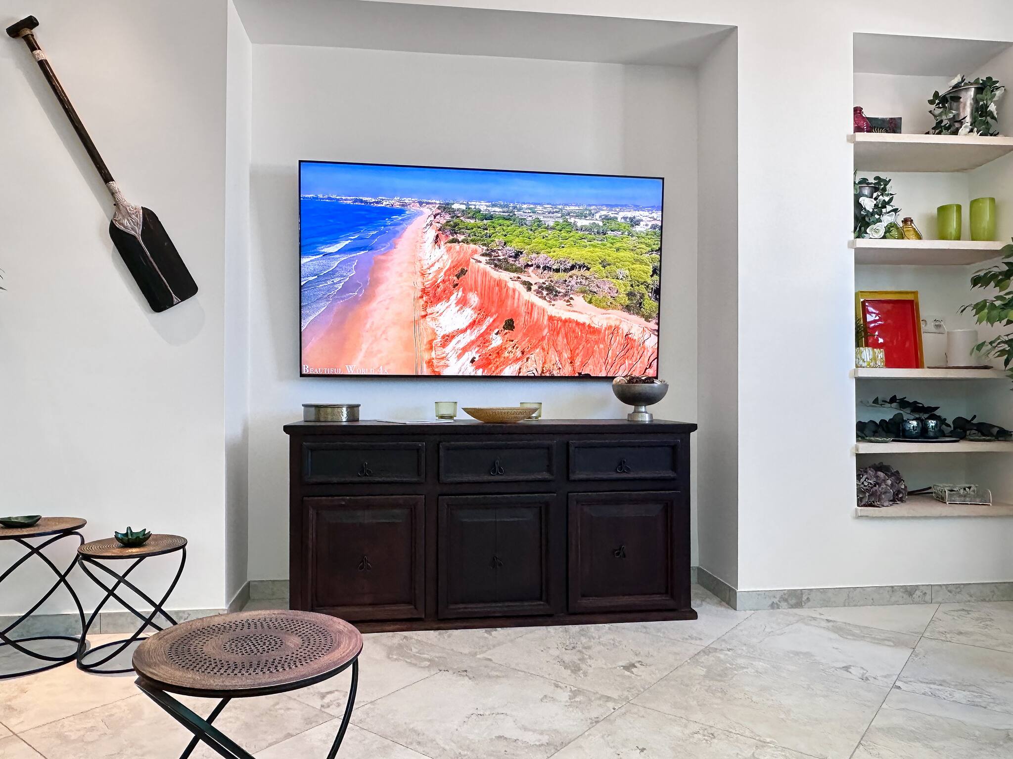 la côte. Un grand téléviseur intelligent de 75 pouces avec de nombreux services de streaming est monté sur le mur dans
