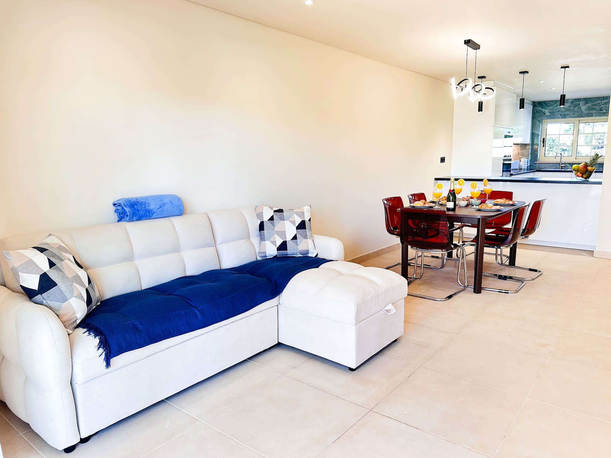 - A espaçosa sala de estar inclui uma TV, uma mesa de jantar para seis pessoas e um sofá, com espaço para acomodar 1 convidado adicional usando uma cama dobrável.