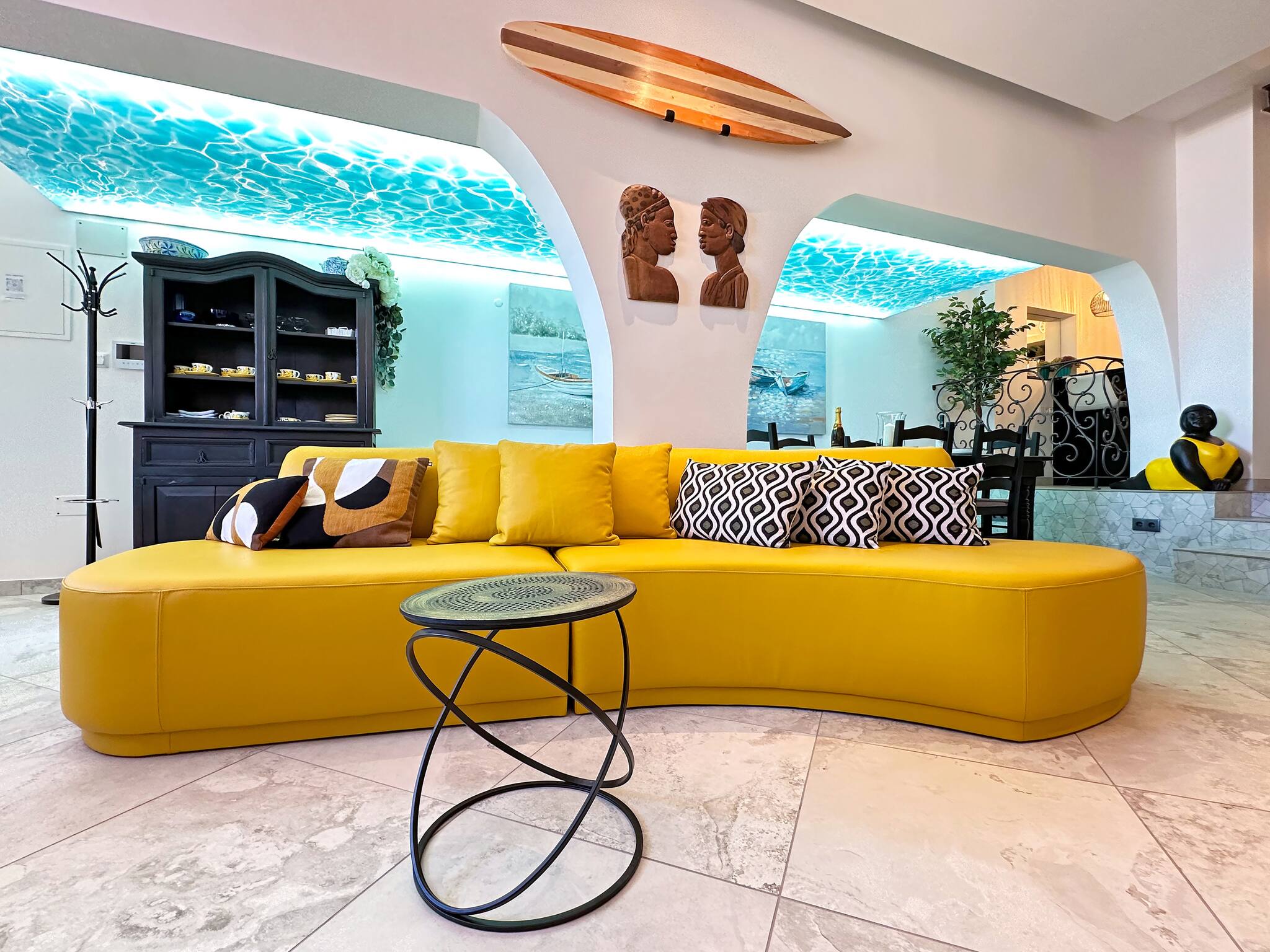 com uma imagem subaquática iluminada que se estende pelo teto. Os arcos laterais conduzem harmoniosamente para uma sala