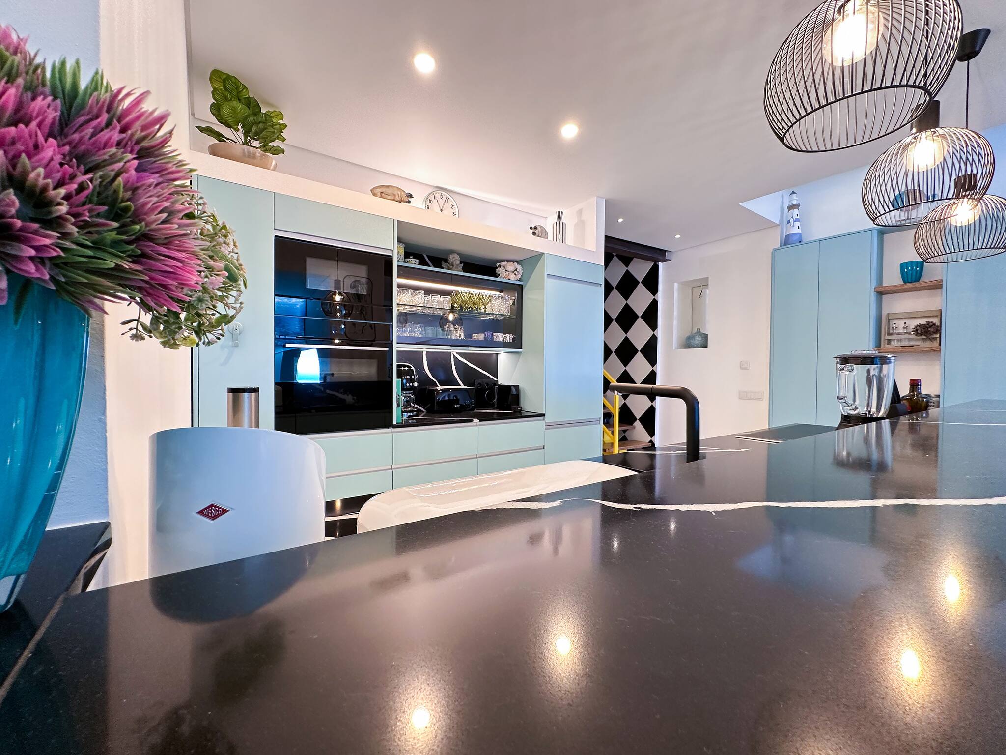 Uma das características de destaque da área da cozinha é o teto de vidro, permitindo que a luz natural ténue inunde todo o espaço. Outra característica é a impressionante escadaria com os seus azulejos de parede quadriculados a preto e branco e degraus vibrantes em amarelo e madeira de castanho, estendendo-se por mais de 12 metros de altura. Evoca uma atmosfera caprichosa de "Alice no País das Maravilhas"...
