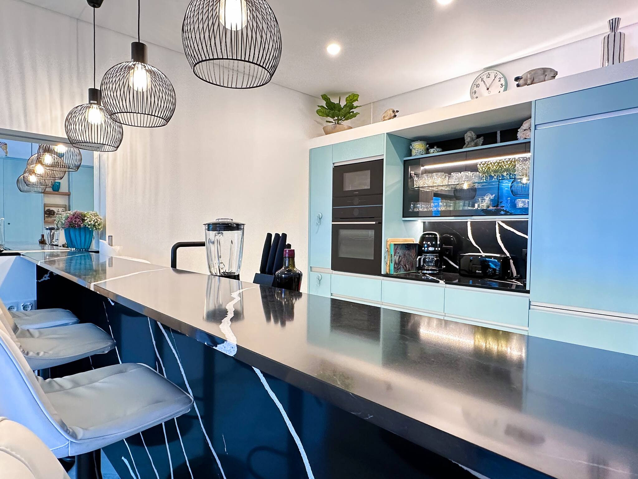 A cozinha impressionante está elegantemente projetada e iluminada, apresentando os mais recentes eletrodomésticos e todos os utensílios de que possa precisar. A conveniente mesa de bar de pedra é perfeita para um lanche rápido ou bebida enquanto conversa com o chef.