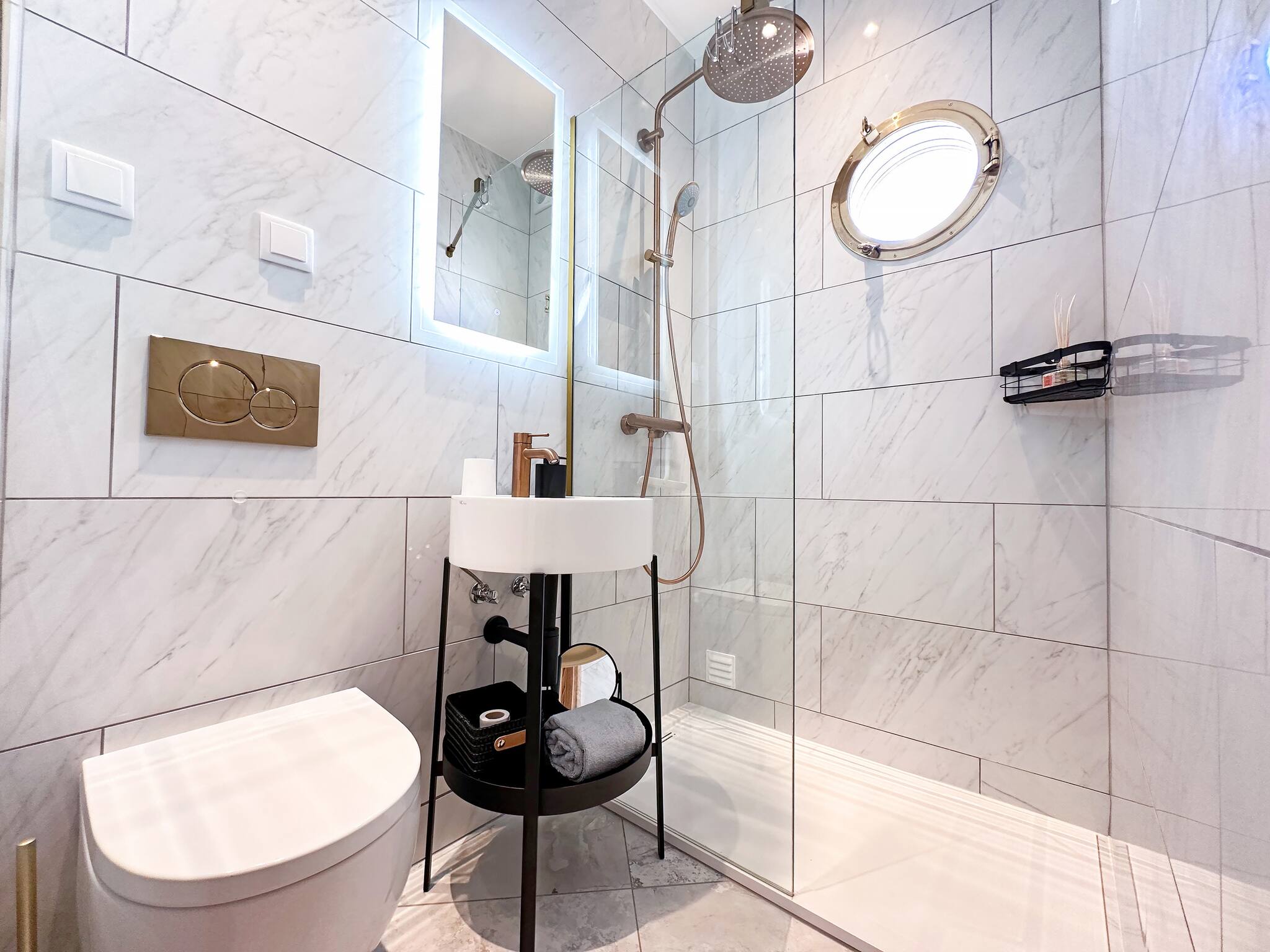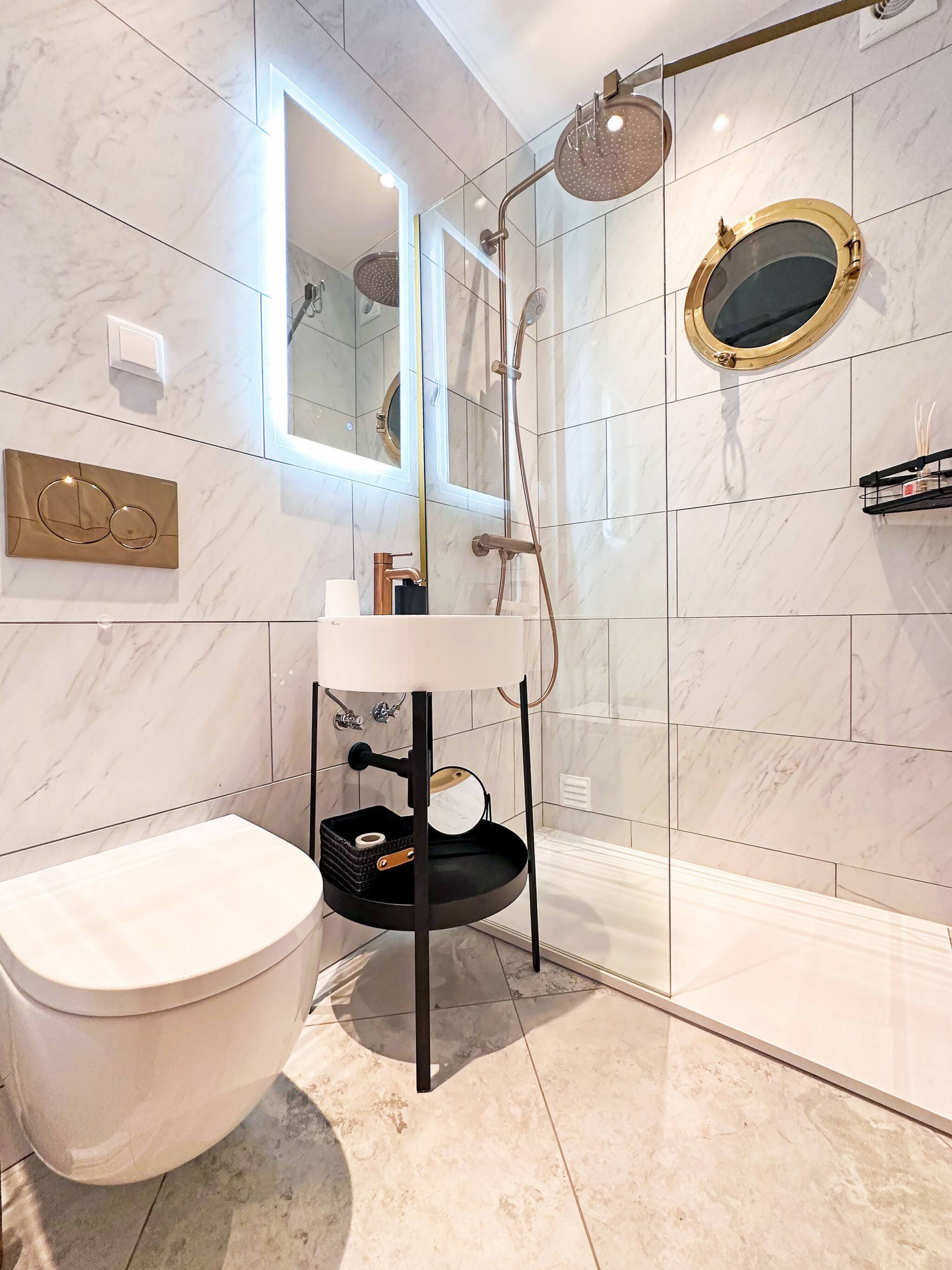 A servir ambos os quartos existe uma casa de banho compacta mas completa com chuveiro. A casa de banho tem um belo e original