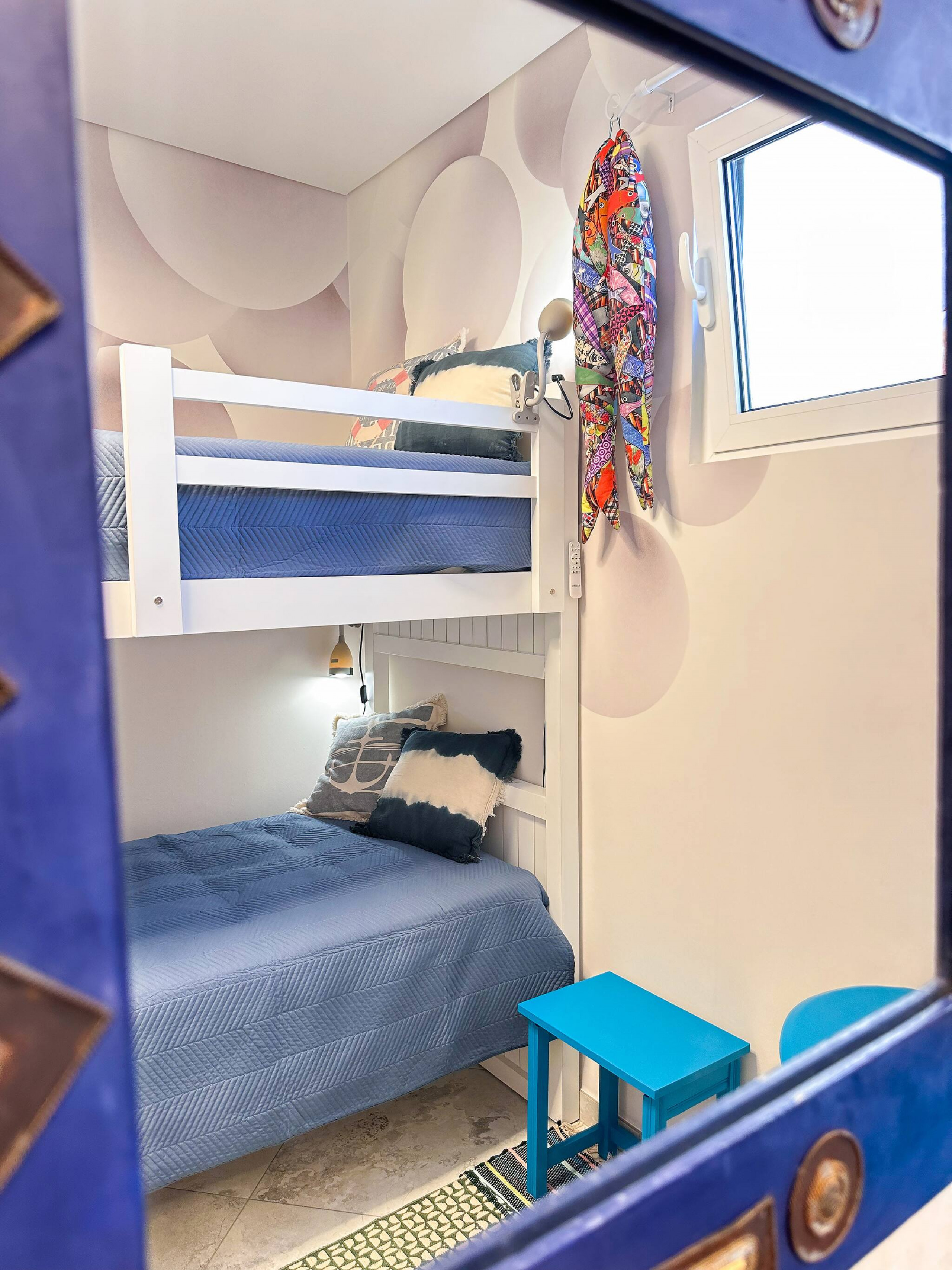 No 1º andar, encontra-se um quarto decorado de forma única com uma encantadora beliche de casal (2x 90x200 camas).