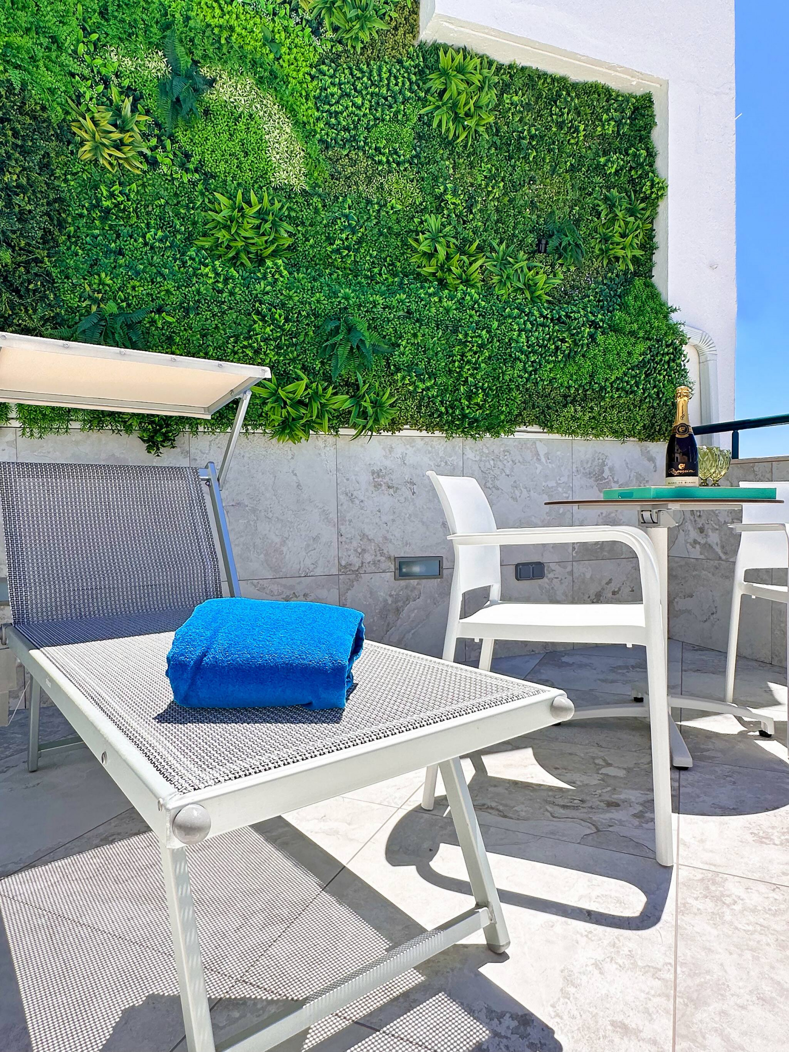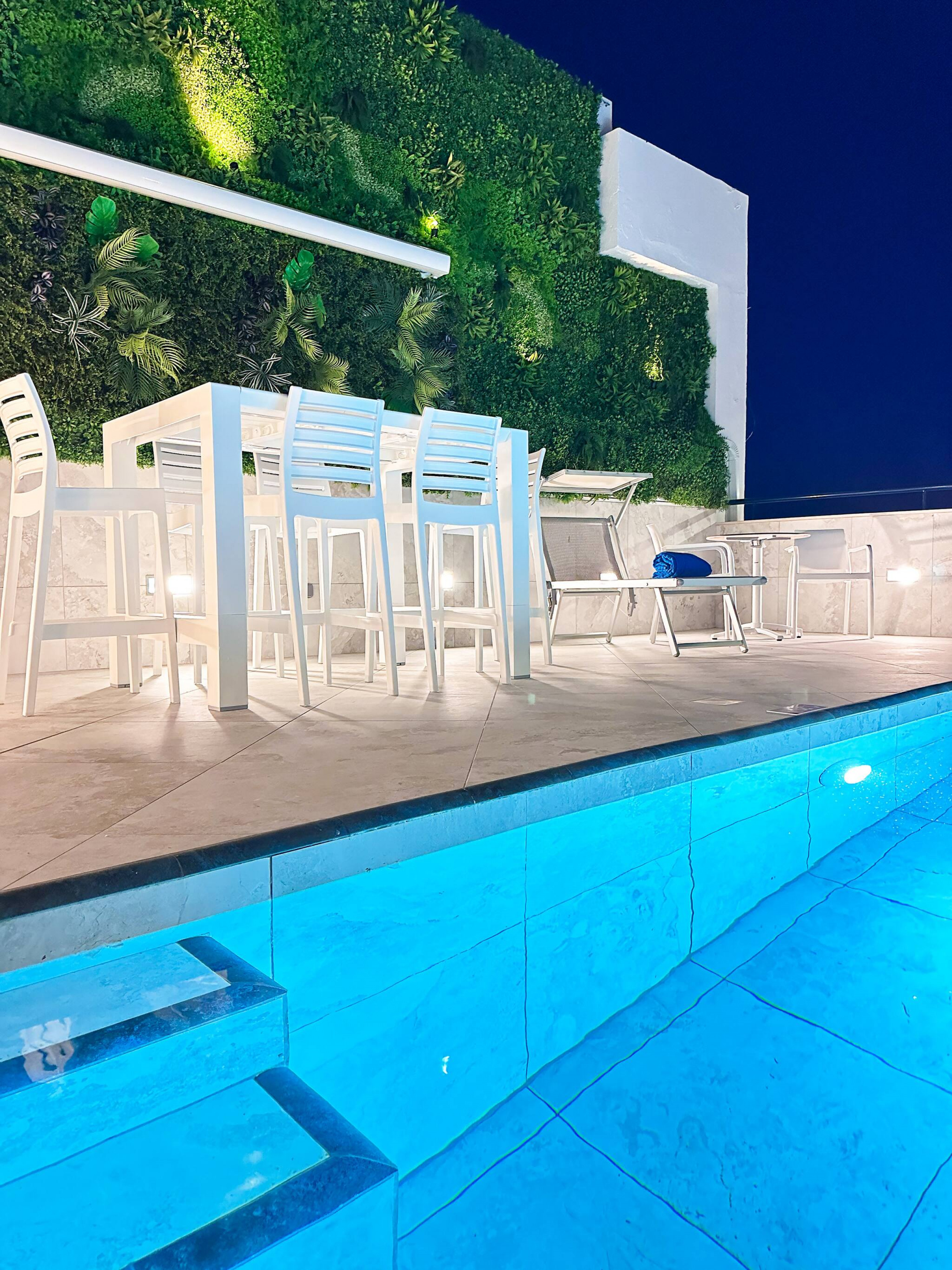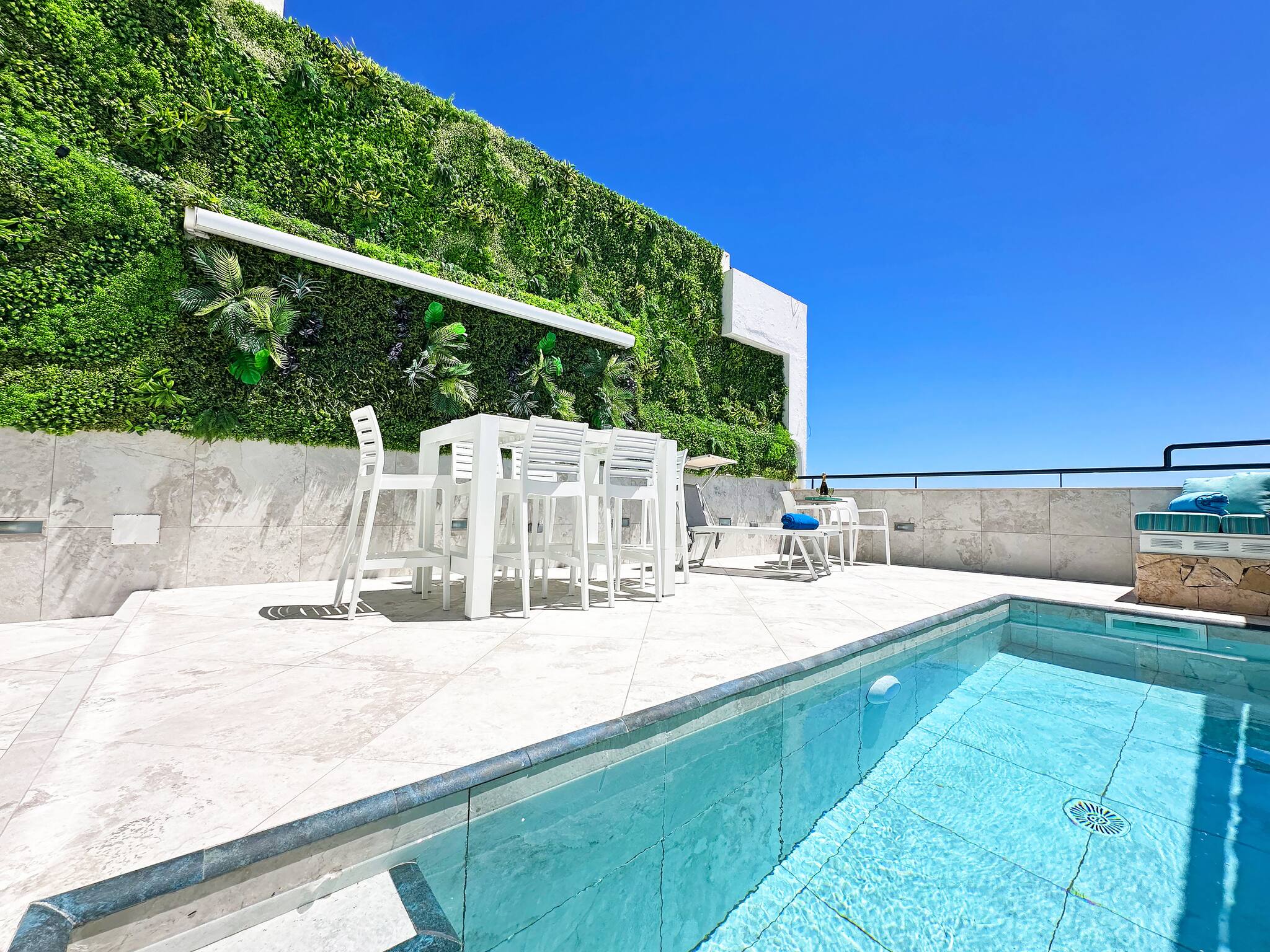 um jardim vertical de 8 metros do outro. Uma piscina moderna e um chuveiro exterior (com água quente) oferecem tudo