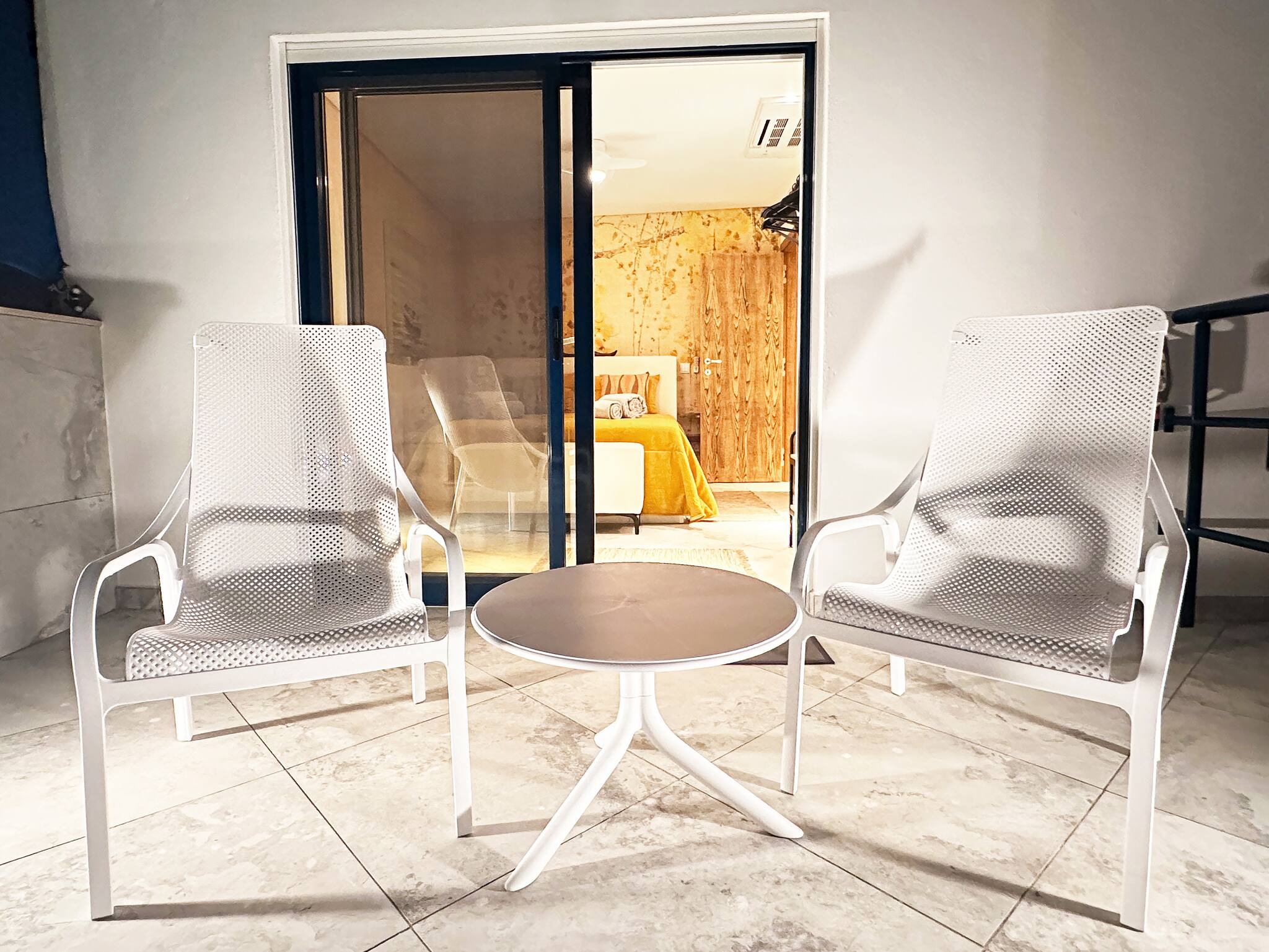 O outro quarto neste piso está equipado com uma cama de casal e portas de correr de vidro do chão ao teto que