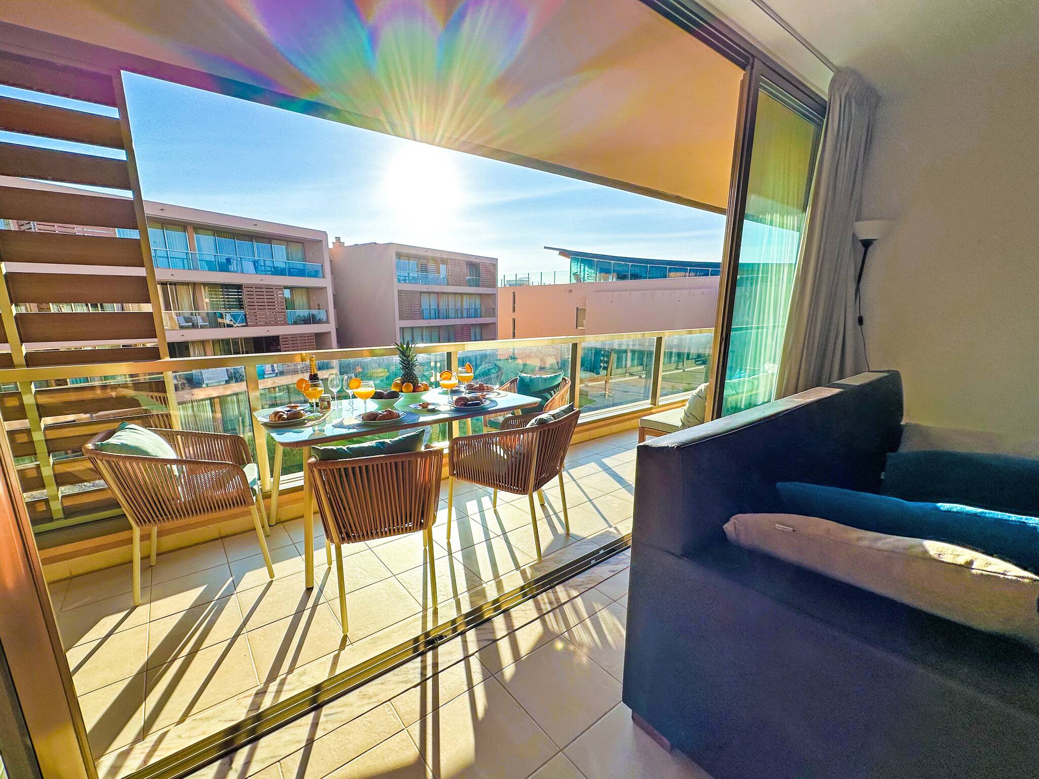 The apartment offers a spacious and elegantly furnished Living and Dining area and a Kitchenette, including a Smart TV, Sound Bar and patio doors leading to the balcony.