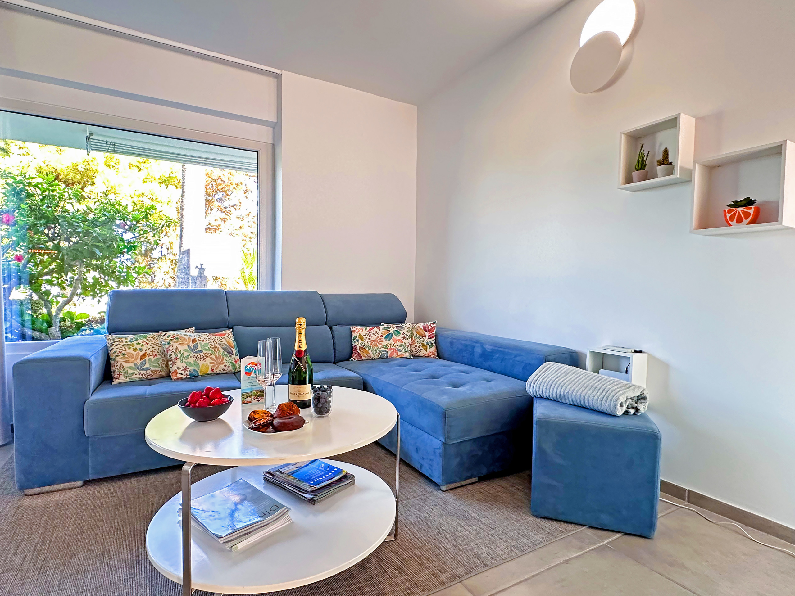 The apartment is fully air-conditioned and exquisitely equipped with a bedroom, including a double bed. The living room is spacious and has dining facilities, as well as a comfortable sofa to relax and/or use as an additional extendable bed. It has high-speed fibre optic internet, so you can stream your favourite Netflix movie on an excellent 50-inch smart TV.