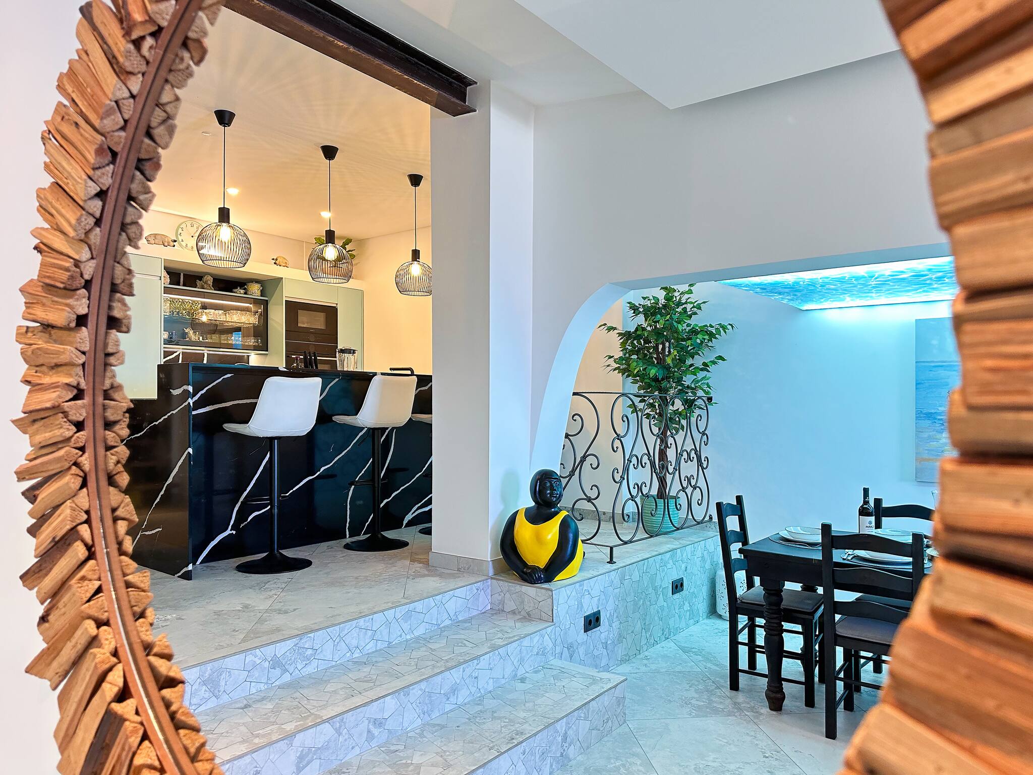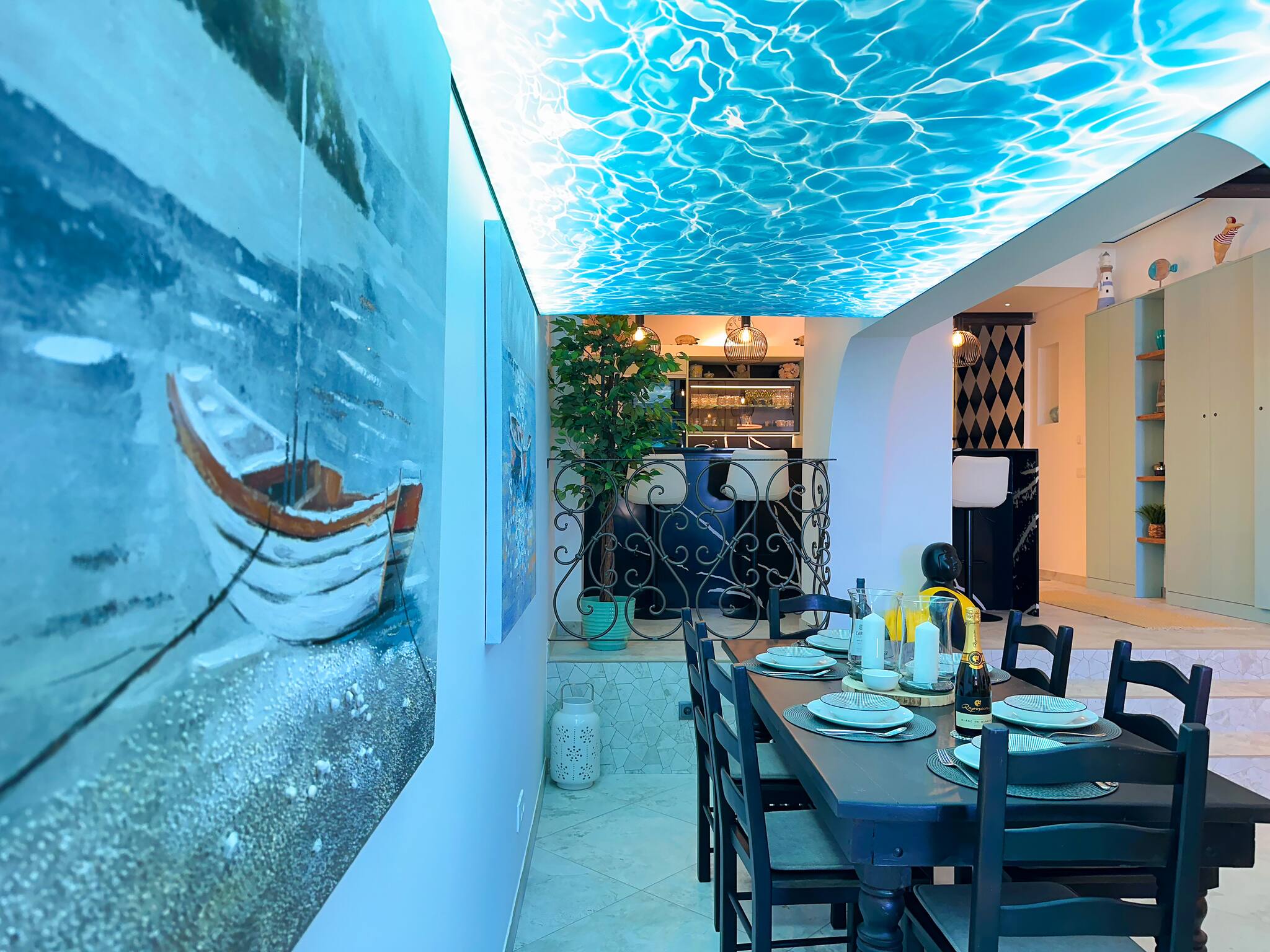 with a lit underwater picture spanning the ceiling. The side arches seamlessly lead into an open-plan living