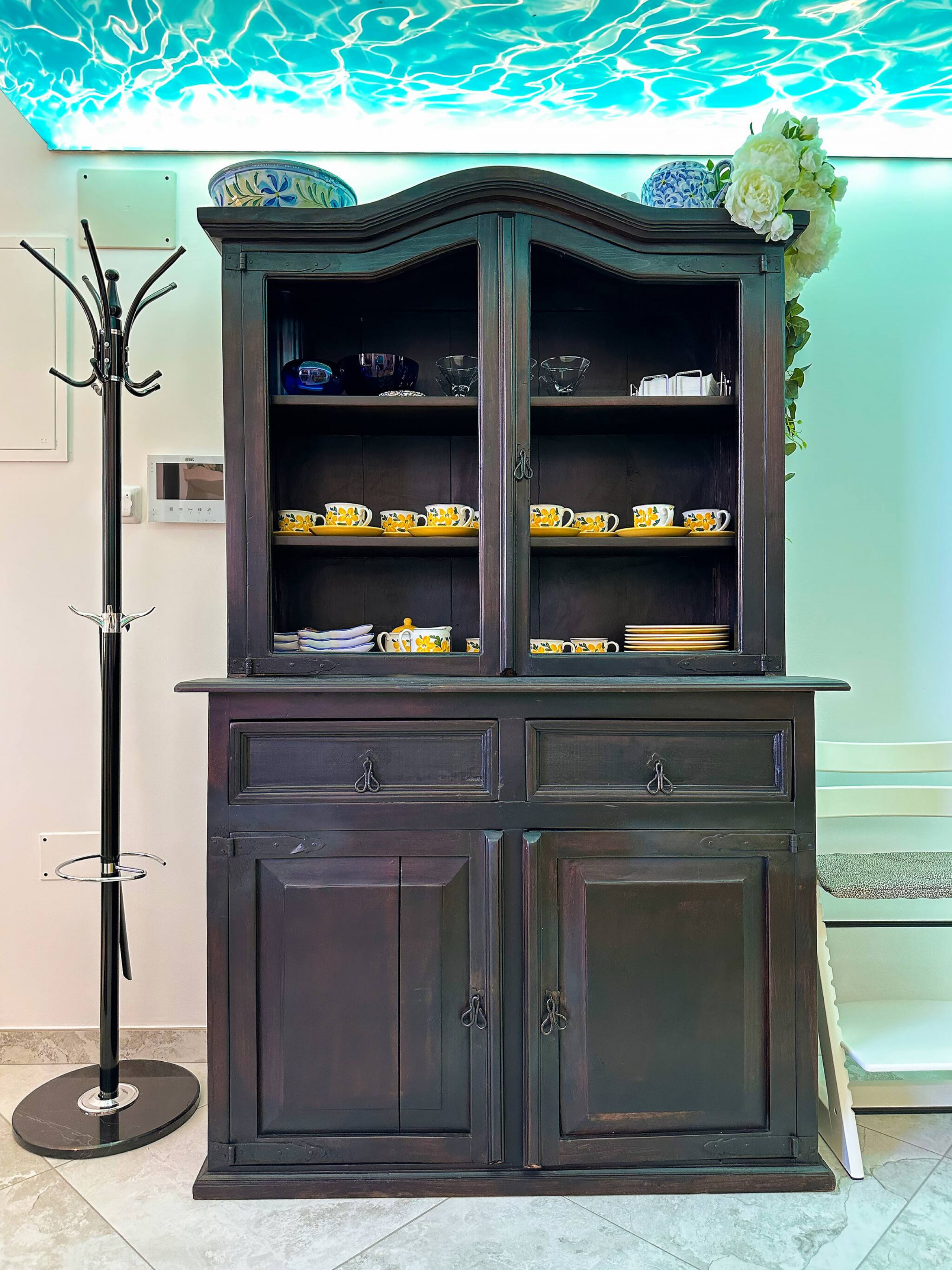 The dining area combines charming antique furniture with modern lighting and décor, creating a harmonious