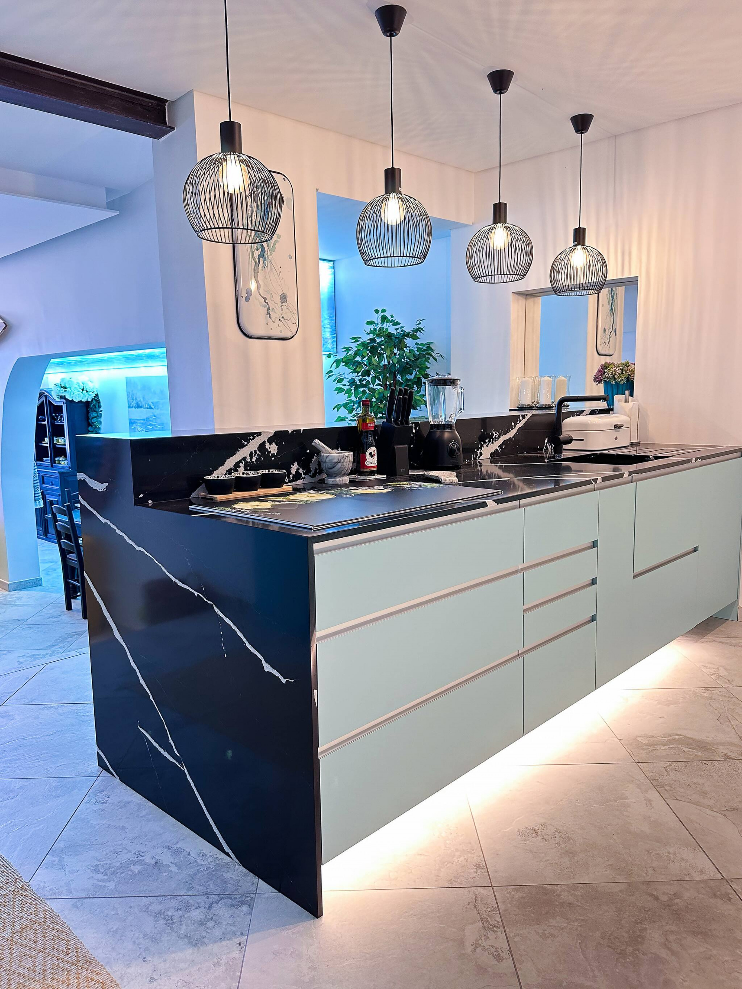 The striking kitchen is elegantly designed and illuminated, featuring the latest appliances and every utensil you