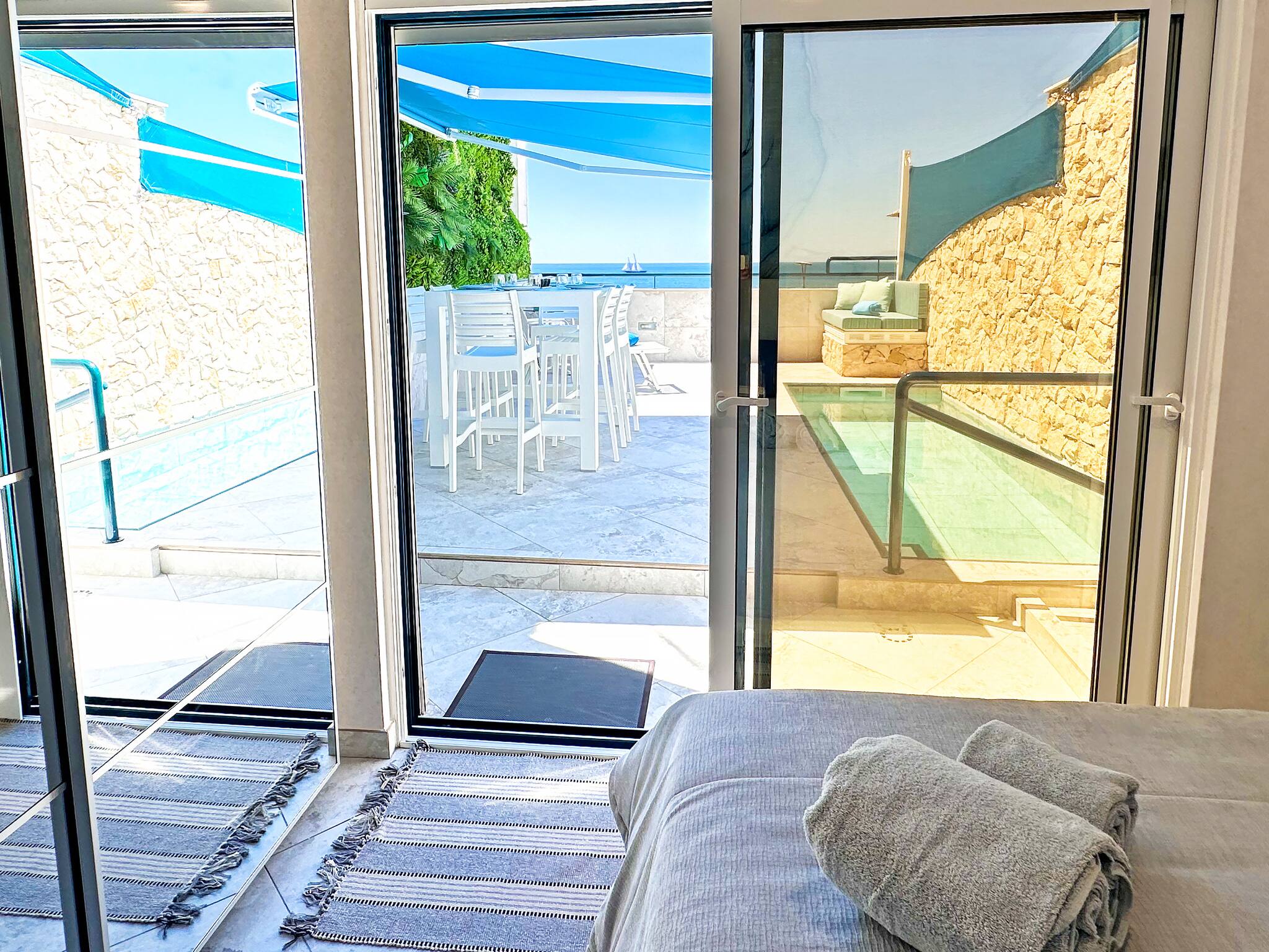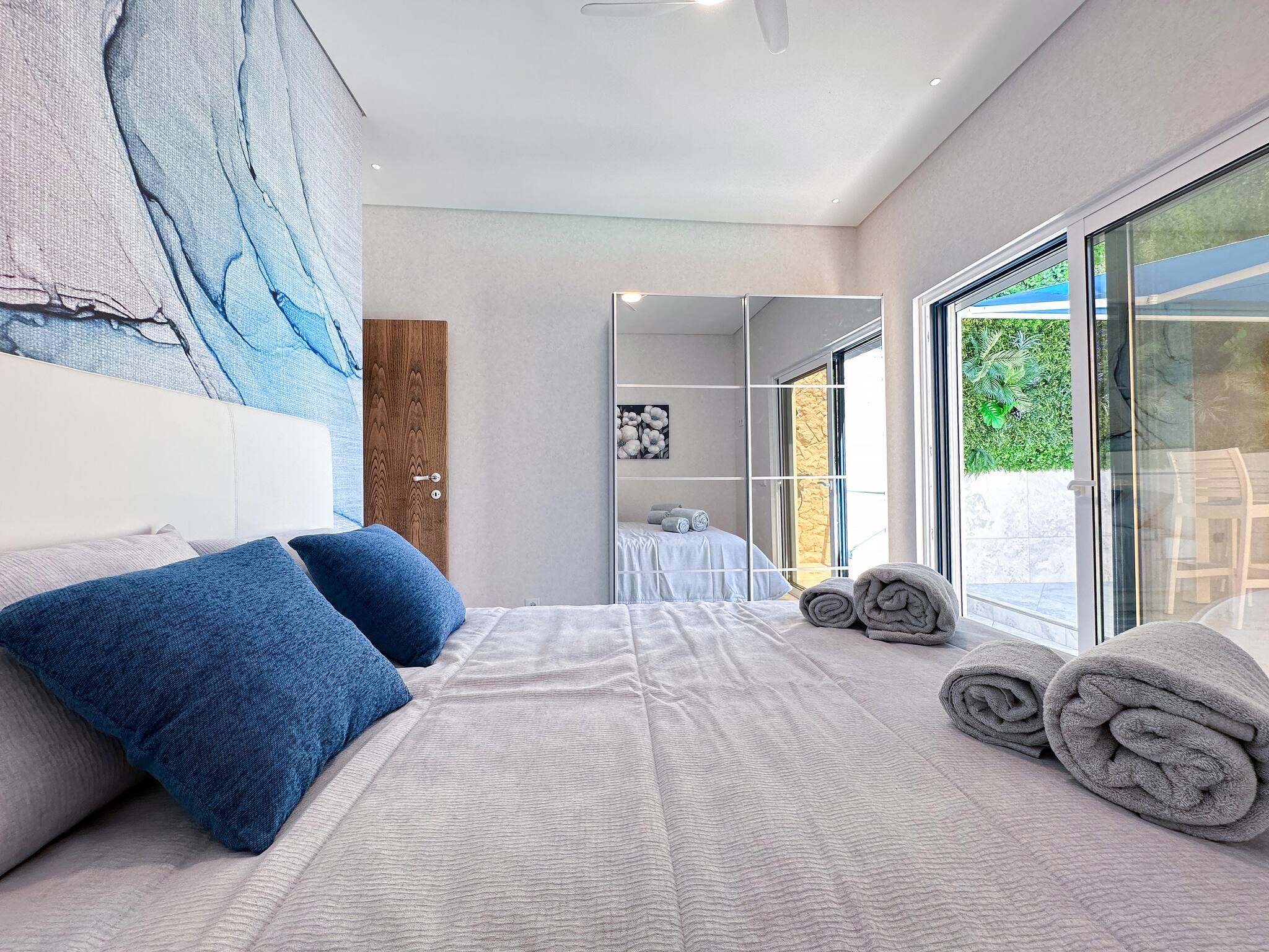 The other bedroom on this level is fitted with a double bed and double floor to ceiling glass sliding doors which