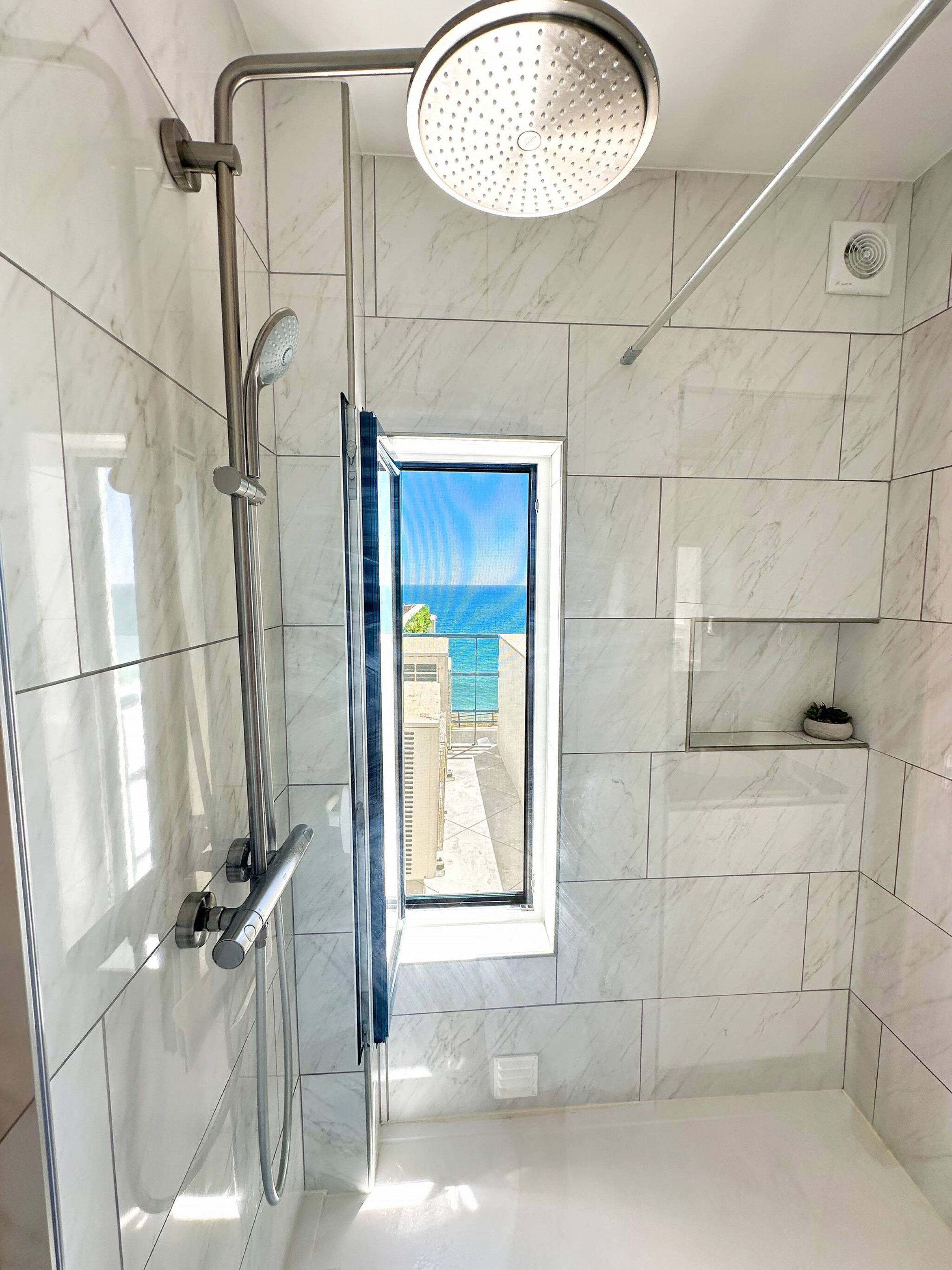 The terrace overlooks the ocean and beach and has stunning views.