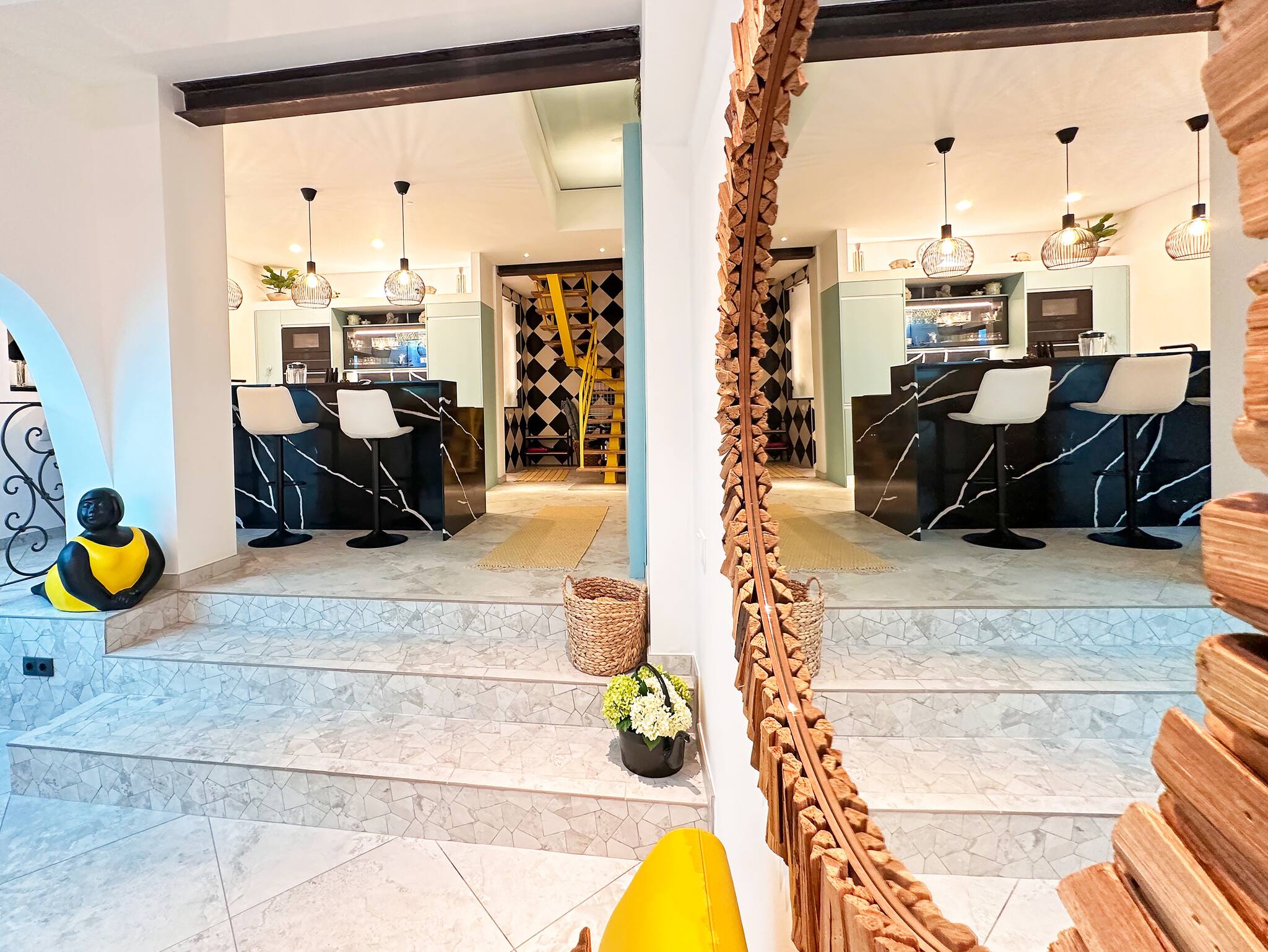 entire space. Another feature, is the striking staircase with its black-and-white checkered wall tiles and vibrant