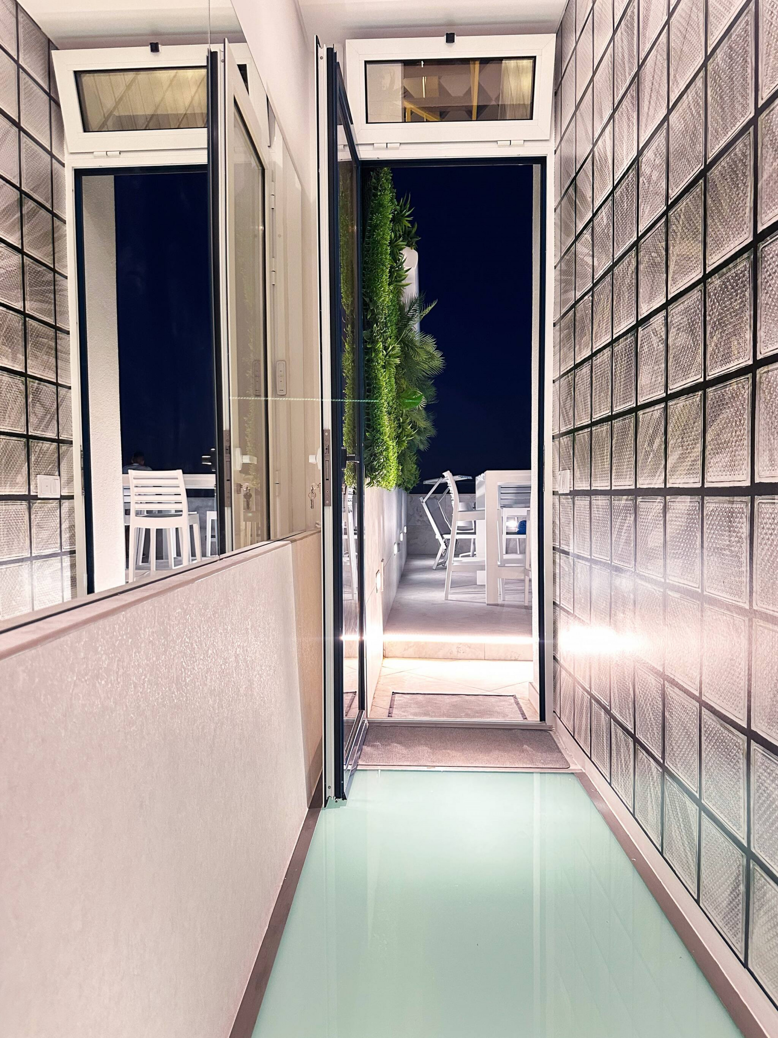 The passage with its glass floor leads to the terrace which is flanked by a rustic stone wall on the one side and